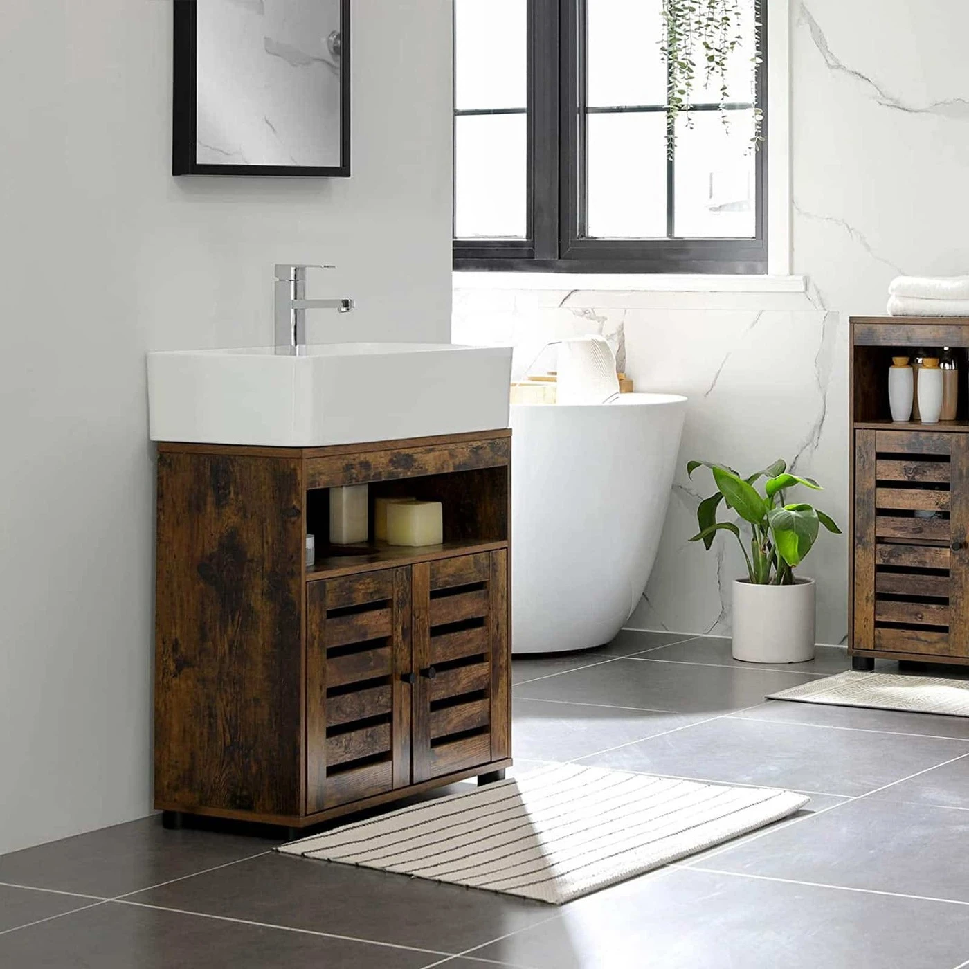 Aprašymas buvo automatiškai išverstas, gali pasitaikyti klaidų.SOS vonios baldai Ar jūsų rankšluosčiai guli vonioje? Ar vis užkliūva už dušo želė buteliukų ant grindų? Pavargote žaisti slėpynių su plaukų džiovintuvu? Šioje vonios spintelėje tvarkingai laikykite visus būtiniausius daiktus. VASAGLE labai palengvina jūsų gyvenimą!Puiki kokybė Šiame kosmetiniame kambaryje yra 2 spintelės durys, kurios dėl kruopštaus darbo sandariai užsidaro. Galbūt jūsų svečiai net paklaus, kur pirkote šią spintelę, nes jiems vienos trūksta!Pristatymo komplektas: - 1 x kosmetinė spintelė - 1 x apsauga nuo apsivertimo - 1 x priedų pakuotė - 1 x instrukcija (DE, EN, FR, ES, IT)Išsami informacija apie gaminį: - Spalva: vintažinė ruda - Medžiaga: medžio drožlių plokštė - Dydis: 60 x 30 x 63 cm (P x P x A) - Sifono angos dydis: 20 x 15 cm - Svoris: 13 kg - Maksimali bendra statinė apkrova : 20 kgVASAGLE Pastabos:- Saugumo sumetimais vaikams neleidžiama laipioti ar žaisti su gaminiu.- Maksimali gaminio statinė apkrova yra 20 kg. Neviršykite šio maksimalaus svorio.- Pritvirtinkite šį gaminį prie sienos su komplekte esančiu apsaugančiu nuo virtimo, kad užtikrintumėte saugų naudojimą.- Nedelsdami nuvalykite ant paviršiaus esančius skysčius sausa šluoste.