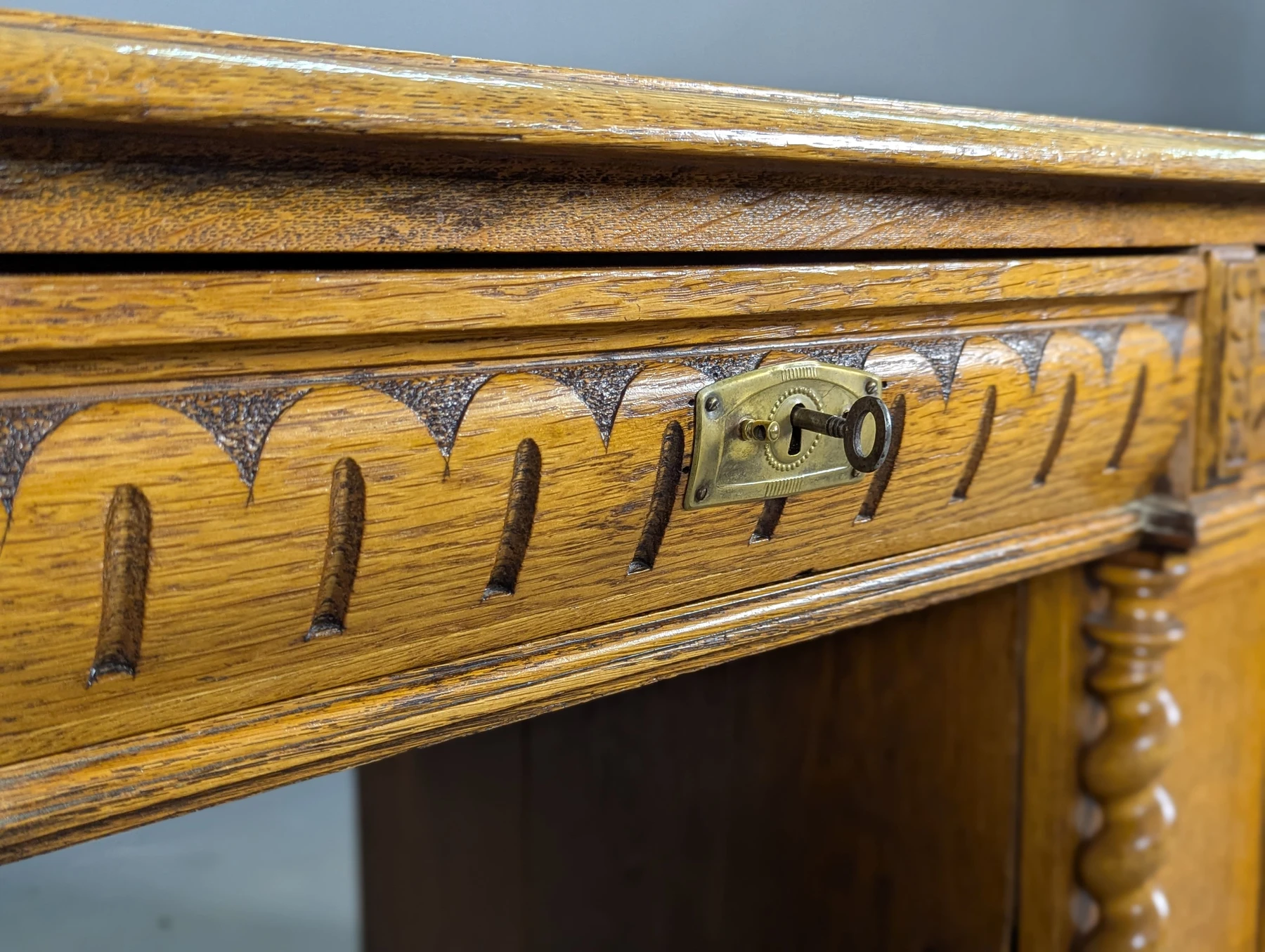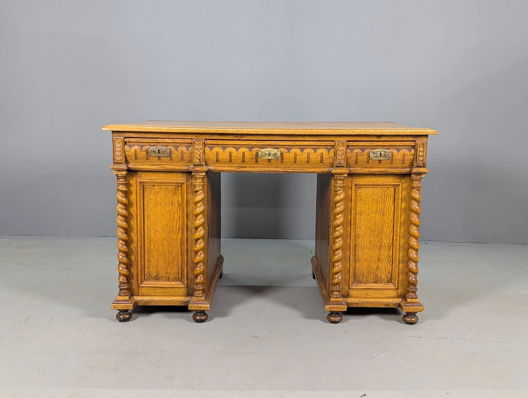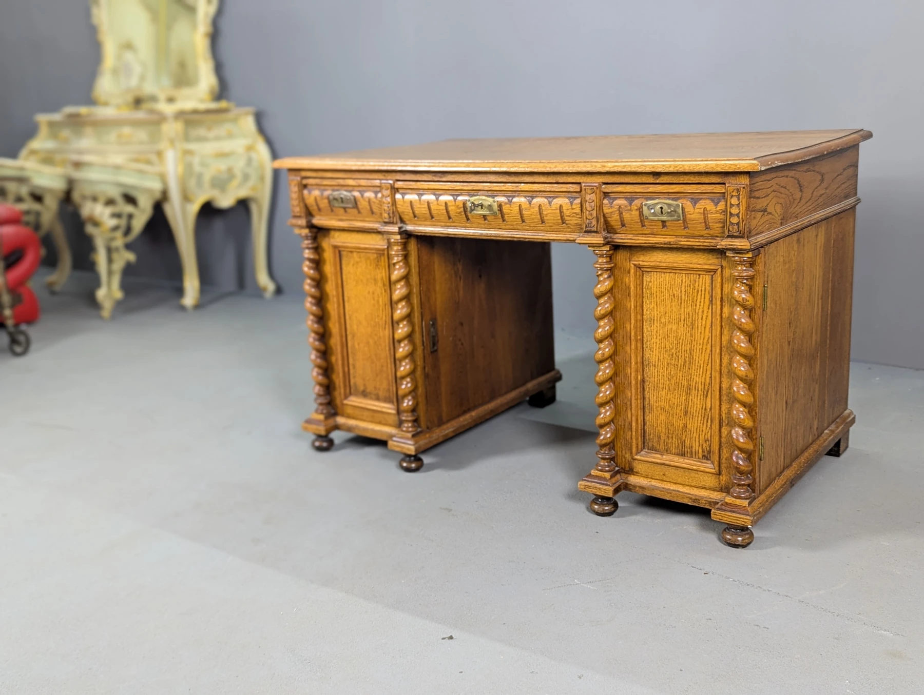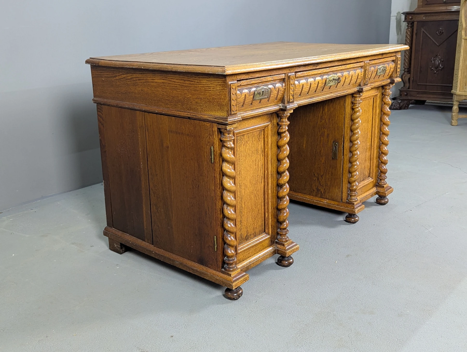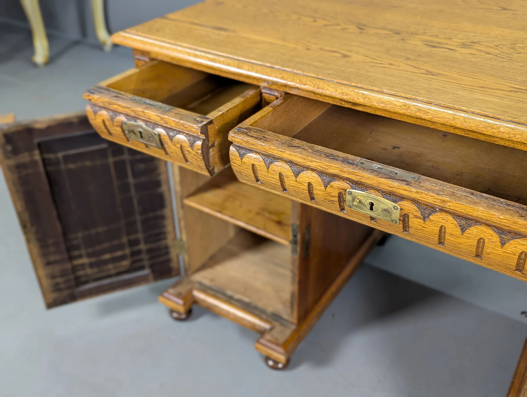 Autentiškas masyvaus ąžuolo rašomasis stalas su elegantiškais vijų formos kojų raižiniais ir talpiomis spintelėmis. Klasikinis, stabilus baldas darbo kambariui ar svetainei, suteikiantis erdvei charakterio ir solidumo.