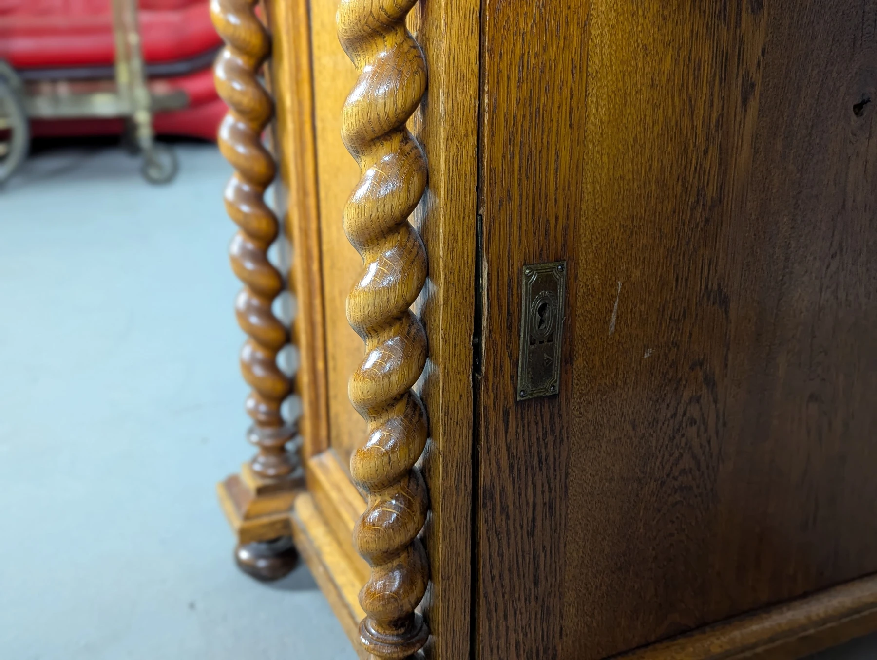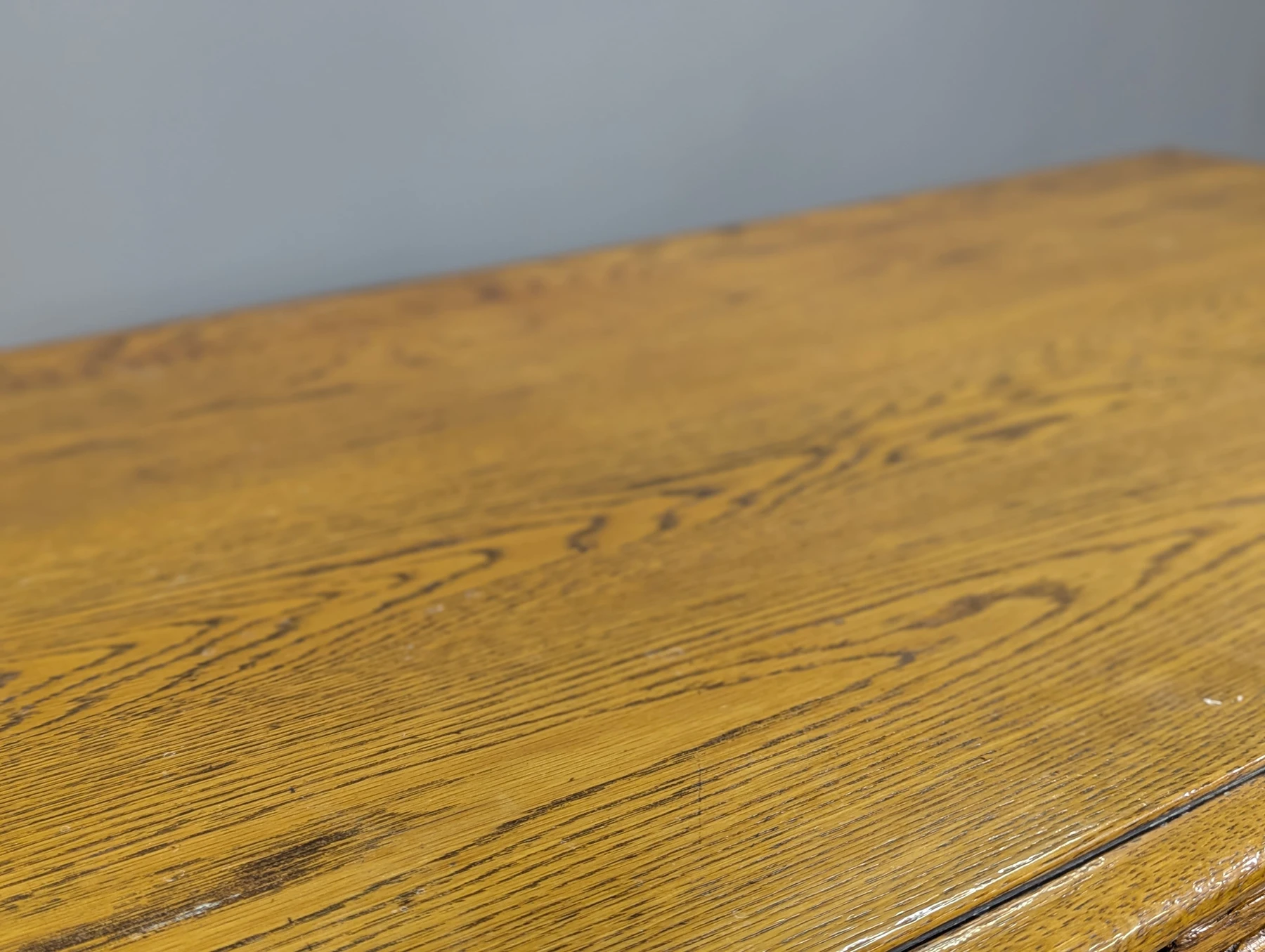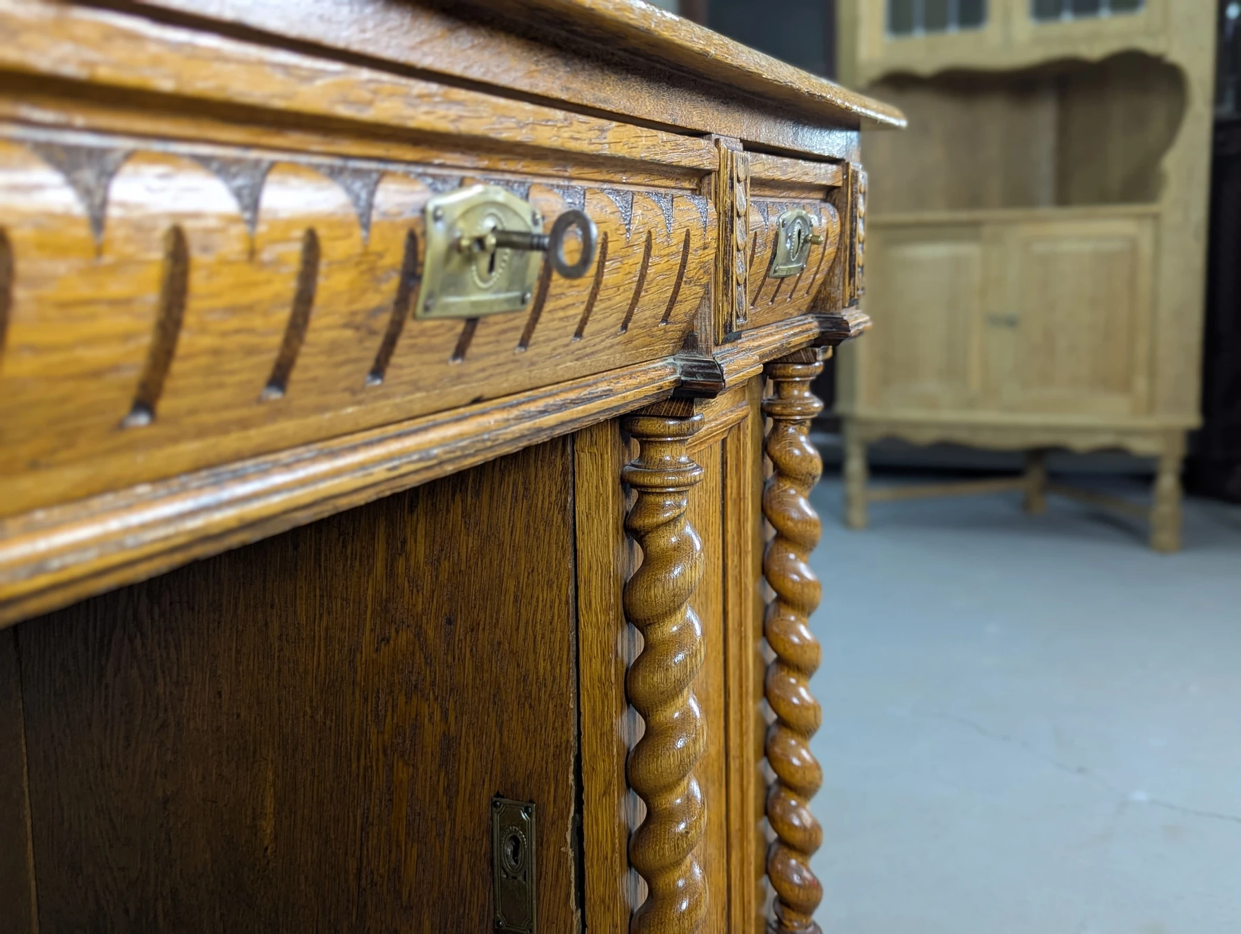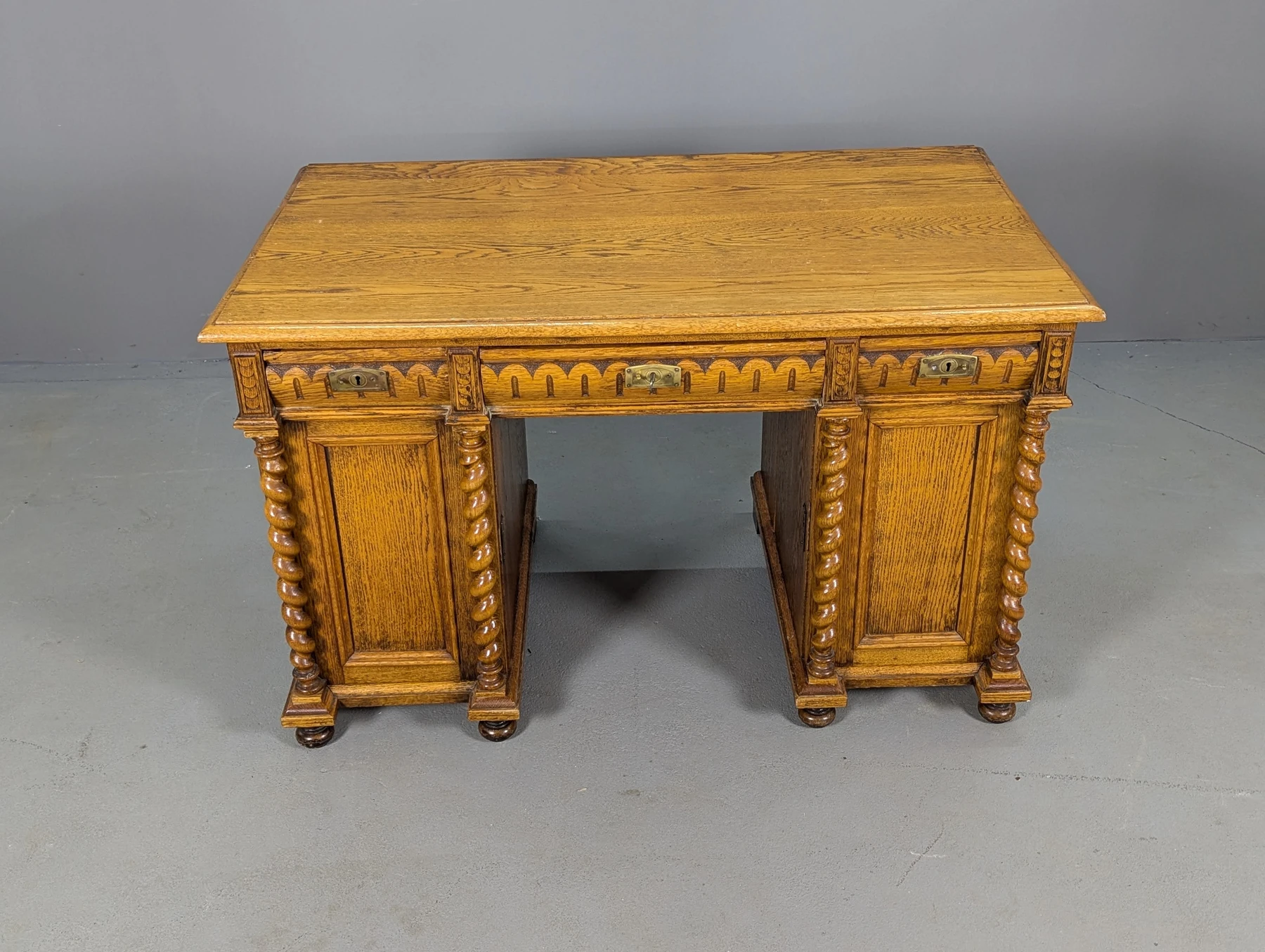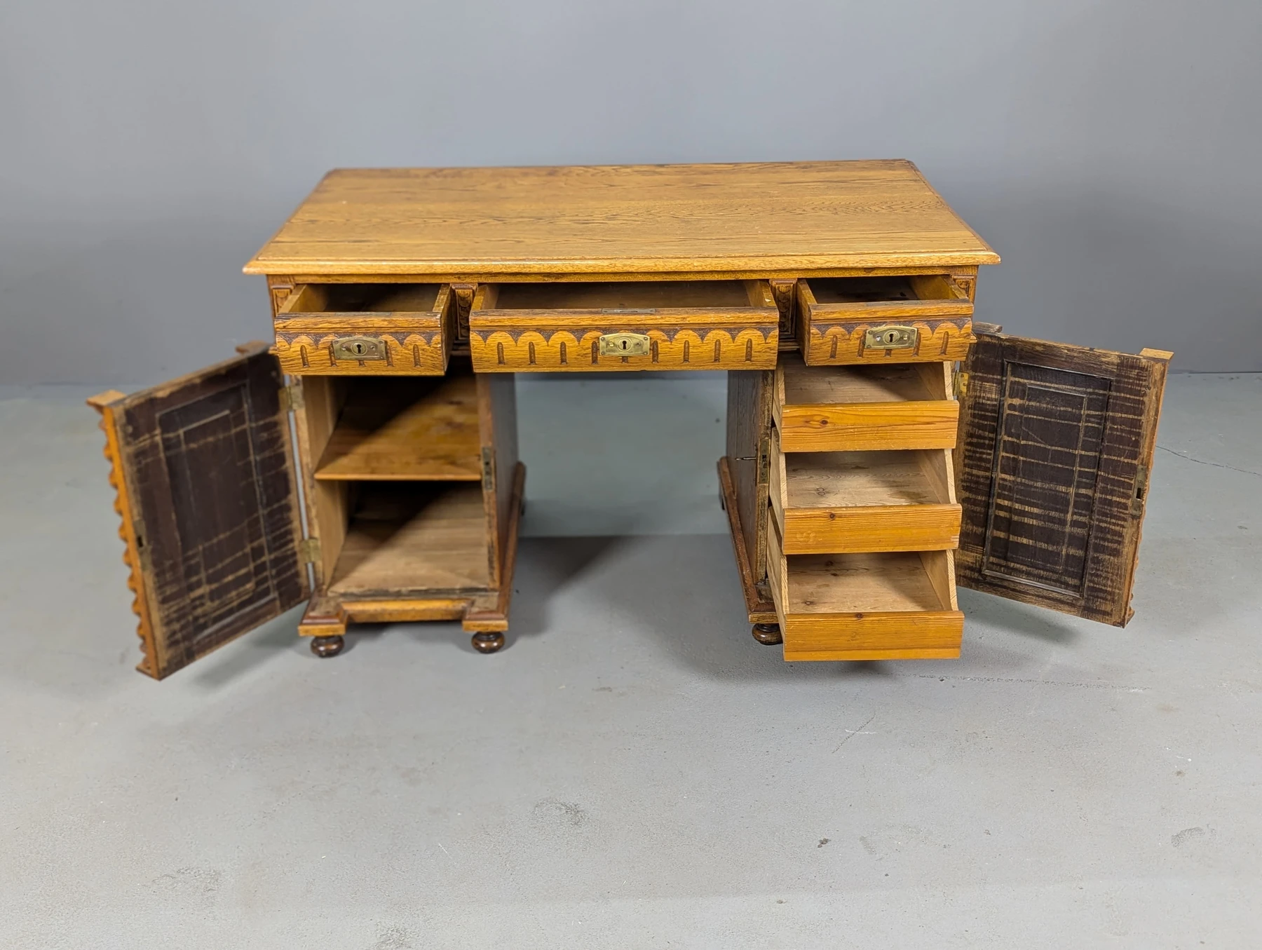Autentiškas masyvaus ąžuolo rašomasis stalas su elegantiškais vijų formos kojų raižiniais ir talpiomis spintelėmis. Klasikinis, stabilus baldas darbo kambariui ar svetainei, suteikiantis erdvei charakterio ir solidumo.
