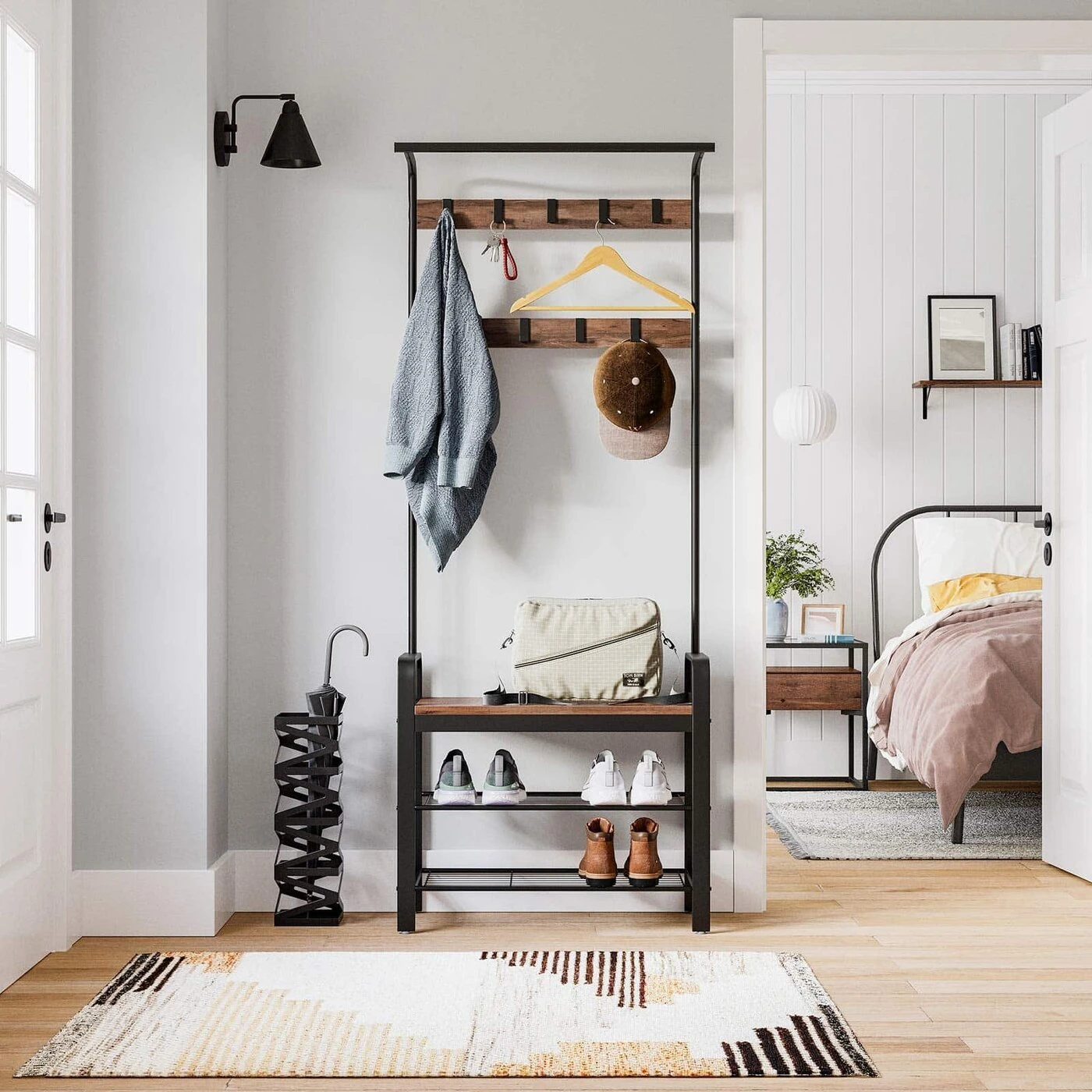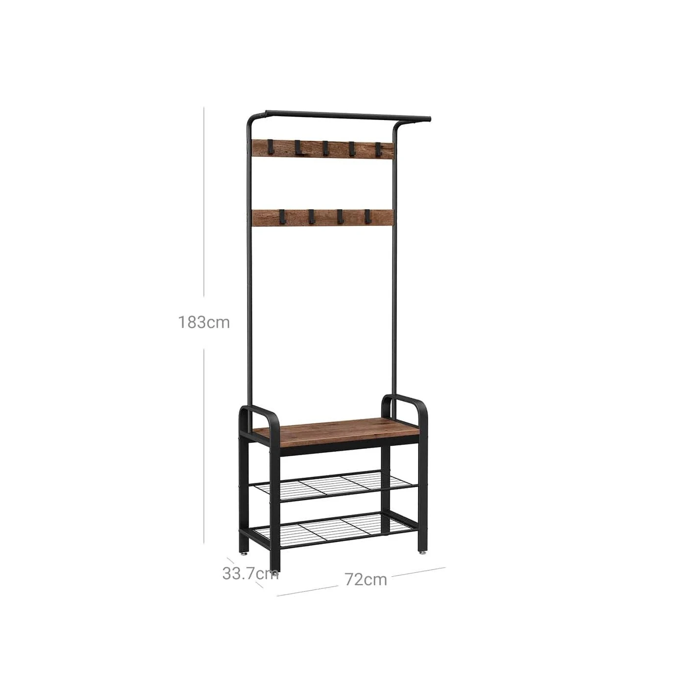 Aprašymas buvo automatiškai išverstas, gali pasitaikyti klaidų.Informacija apie gaminį: - Spalva: Lazdyno juoda - Medžiaga: Medienos drožlių plokštės, Plienas - Dydis: 72 x 33,7 x 183 cm (P x P x A) - Svoris: 9,8 kg - Maksimali statinė apkrova vienam kabliui: 3 kg - Maks. statinis krūvis sėdynės apkrova: 80 kgPristatymo komplektas: - 1 x palto stovas - 1 x priedų paketas - 1 x apsaugos nuo posvyrio įtaisas - 1 x rankinis (DE, EN, FR, IT, ES) VASAGLE Pastabos: - Saugumo sumetimais vaikams draudžiama lipti ant gaminio arba žaisti su juo - Maksimali sėdynės statinė apkrova yra 80 kg, o kablio - 3 kg. Neviršykite šio maksimalaus svorio. – Pritvirtinkite šį gaminį prie sienos su komplekte esančiu neapvirtimu, kad užtikrintumėte saugų naudojimą.