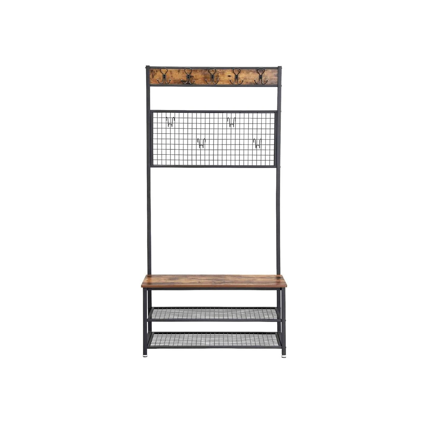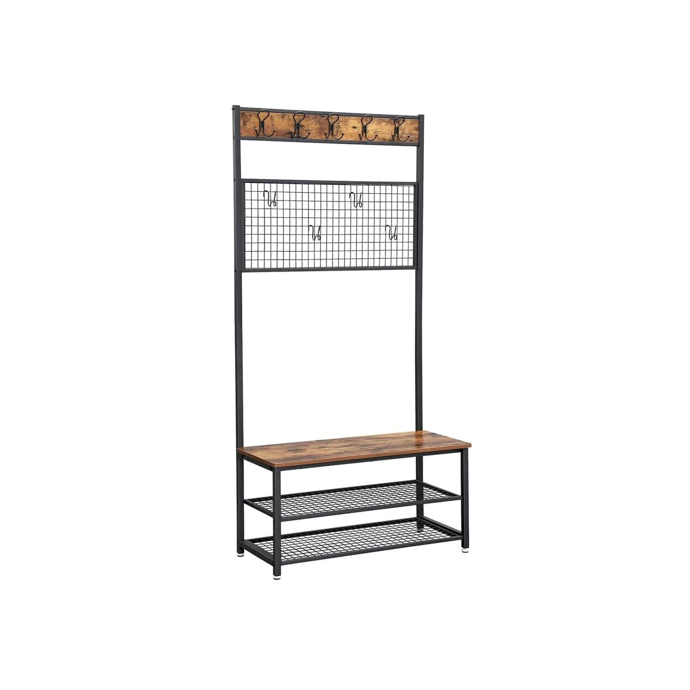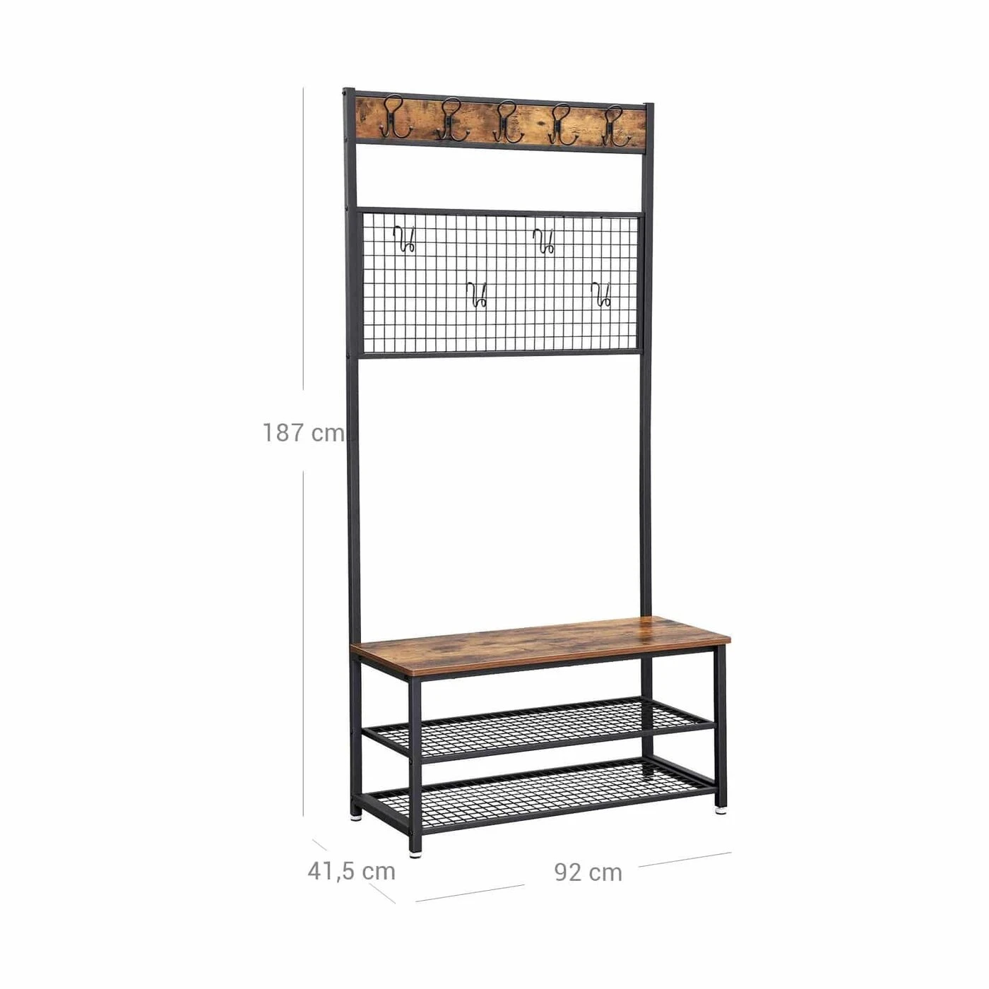 Aprašymas buvo automatiškai išverstas, gali pasitaikyti klaidų.VASAGLE dizaineriai nuolat pateikia naujų idėjų praktiškiems baldams, kurie stilingai ir už prieinamą kainą gali padaryti jūsų gyvenimą šiek tiek patogesnį. Tai suteikia galimybę savo namus paversti kažkuo ypatinga. Kaimiška pramoninio dizaino drabužių spinta Pavyzdžiui, jie suprojektavo aukščiau pavaizduotą drabužių kabyklą su suoliuku, kuris suteikia jums patogią sėdėjimą, taip pat 2 lentynas batams laikyti ir 9 kabliukus raktams, rankinėms ar drabužiams laikyti. Metalinis tinklelis vidurinėje dalyje taip pat gali būti naudojamas kaip foto sienelė, užrašų lenta, atvirukas ar auskarų tvarkyklė. Sukurta madingo pramoninio dizaino ir su kaimiškais mediniais elementais, rūbų kabykla ypač tinka didelėms ar atviroms patalpoms, kuriose dar nėra per daug kitų baldų. Padėkite drabužių kabyklą savo koridoriuje, pavyzdžiui, kad galėtumėte pakabinti striukes, paltus ir patogiai apsiauti batus. Tačiau ši spinta neturėtų būti vienintelė pramoninio dizaino detalė jūsų namuose. Taip pat kviečiame pasižiūrėti ir kitas VASAGLE kompozicijas.Išsami informacija apie gaminį: - Spalva: vintažinė ruda-juoda - Medžiaga: medžio drožlių plokštės, geležinis rėmas - Dydis: 92 x 41,5 x 187 cm (P x P x A) - Svoris: 15,9 kg - Maksimali suoliuko statinė apkrova: 100 kg - Maksimali tinklelio lentynos statinė apkrova: 20 kg - Maksimali statinė apkrova vienam kabliui: 3 kg Pristatymo komplektas: - 1 x drabužių spinta - 1 x krepšys priedams - 1 x apsaugantis nuo apvirtimo - 1 x instrukcijos (DE, EN) , FR, ES, IT) VASAGLE pastabos: - Norėdami užtikrinti drabužių spintos saugumą, naudokite apsaugos nuo apsivertimą ir pritvirtinkite gaminį prie sienos. - Nekabinkite jokių per sunkių daiktų ant medinės lentos viršutinėje dalyje arba ant kabliukų.