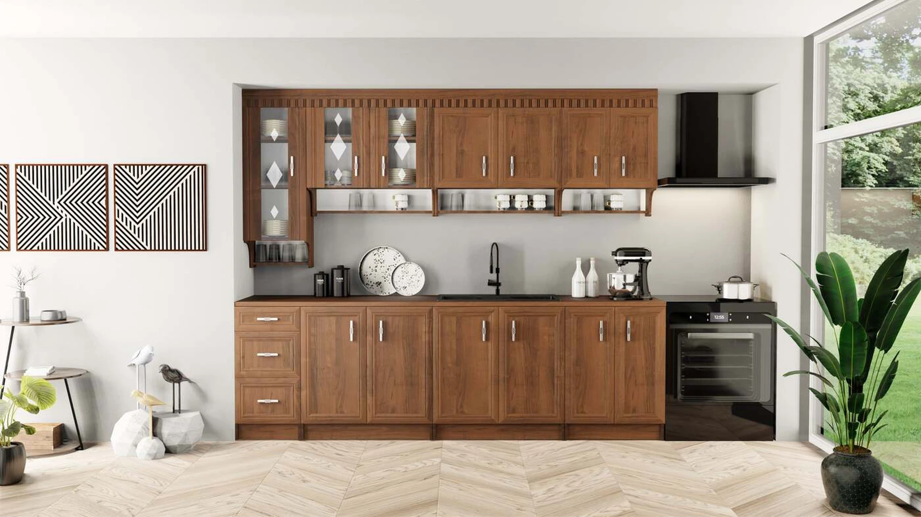komplekto ilgis - 260 cm, stalviršio storis - 28 mm, fasadai pagaminti iš MDF, spalvos: priekis: riešutas, korpusas: riešutas, stalviršis: riešutas