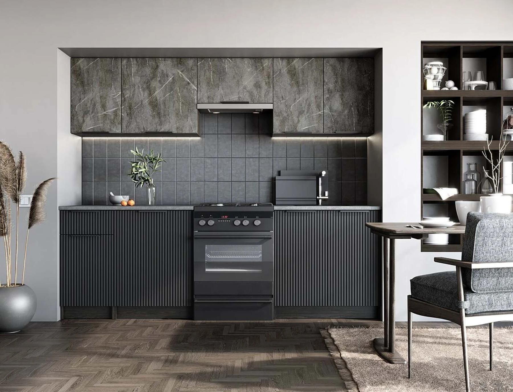komplekto ilgis: 240 cm, MDF apatiniai spintelių fasadai, dujiniai keltuvai, stalviršio storis. 28 mm, spalva: priekis - pilkas marmuras / juodas, korpusas - anglies mediena, stalviršis - pilkas