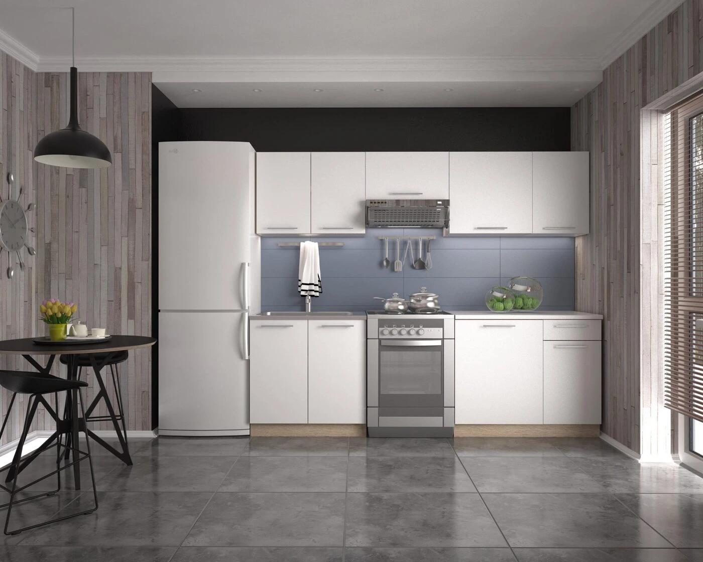 Modernaus dizaino virtuvės komplekto DARIA ilgis: 240 cm. Stalviršio storis: 28 mm. Spalvos: fasadas - baltas, korpusas - ąžuolas sonoma, stalviršis - baltas.