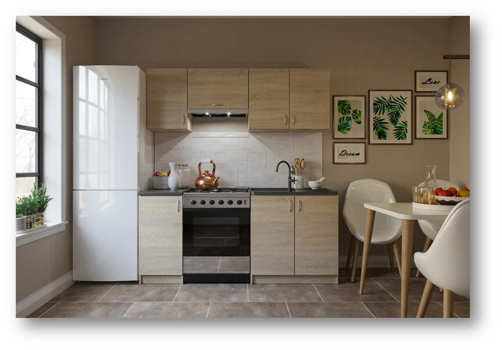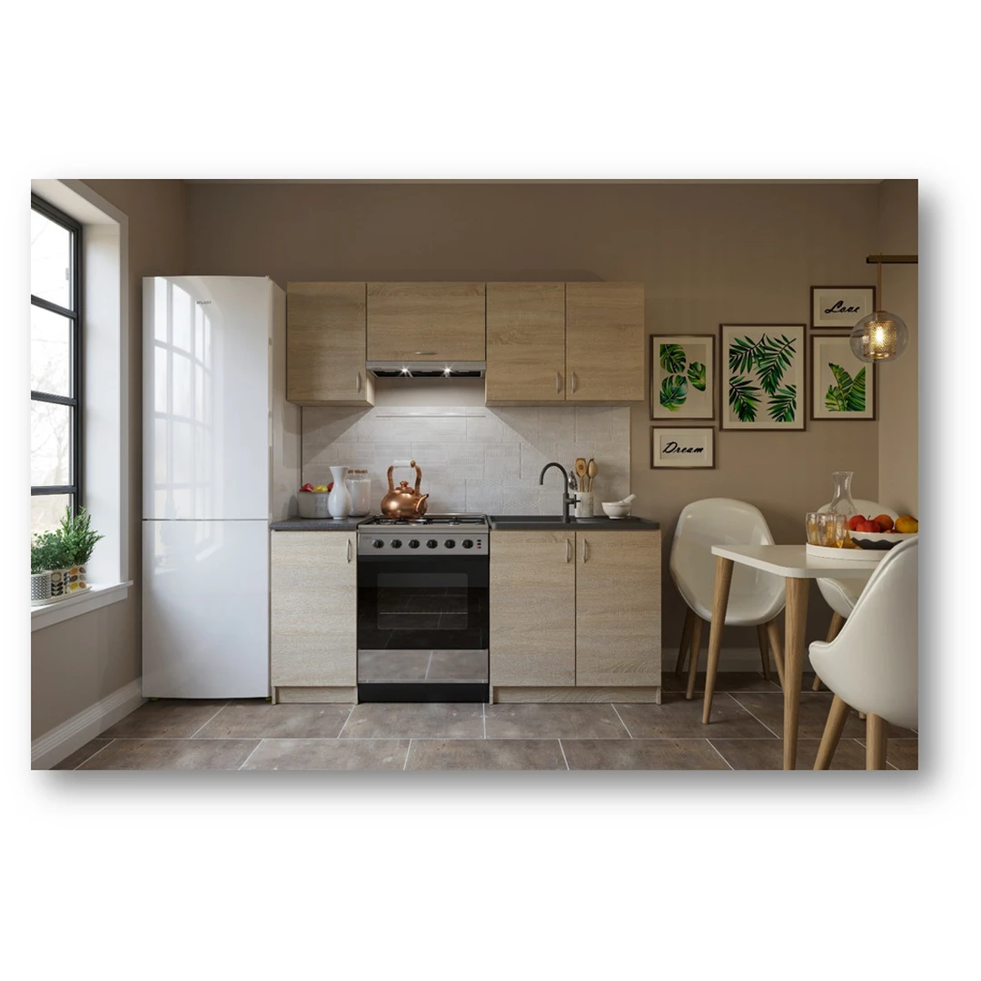 Virtuvės baldų komplektas už itin prieinamą kainą, puikiai pasitarnaus Jūsų virtuvėje. Virtuvės komplekto ilgis: 180 cm. Baldui būdingas dujinis keltuvas. Stalviršio storis: 28 mm. Spalva: fasadas - ąžuolas sonoma, korpusas - ąžuolas sonoma, stalviršis - pilkas.