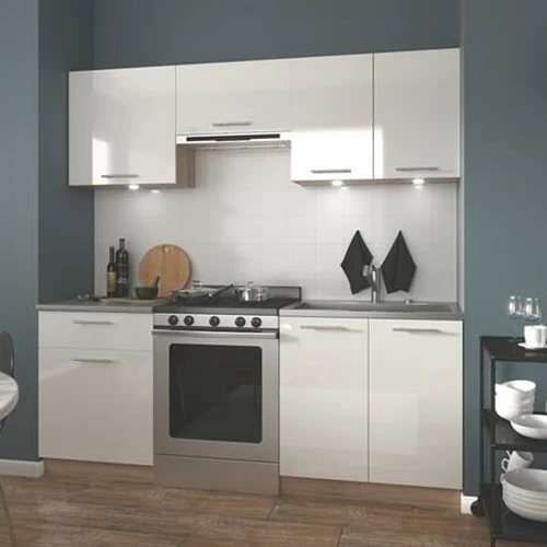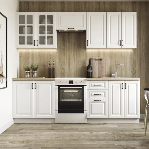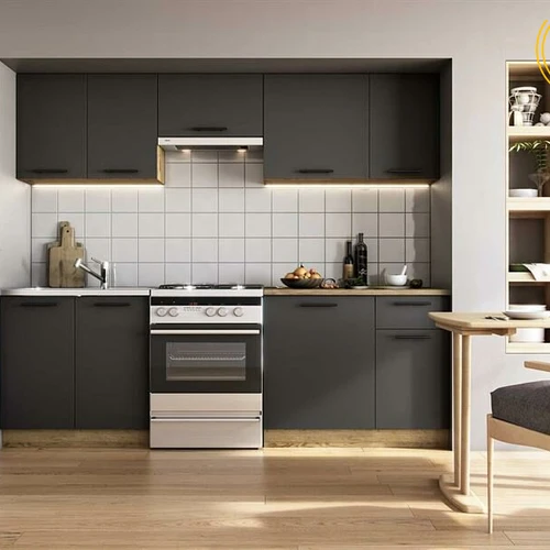 Modernaus dizaino virtuvės komplekto KATIA ilgis: 220 cm. Stalviršio storis: 28 mm. Spalvos: fasadas - šviesios smėlio spalvos / ąžuolas san marino, korpusas - baltas, stalviršis - baltas.