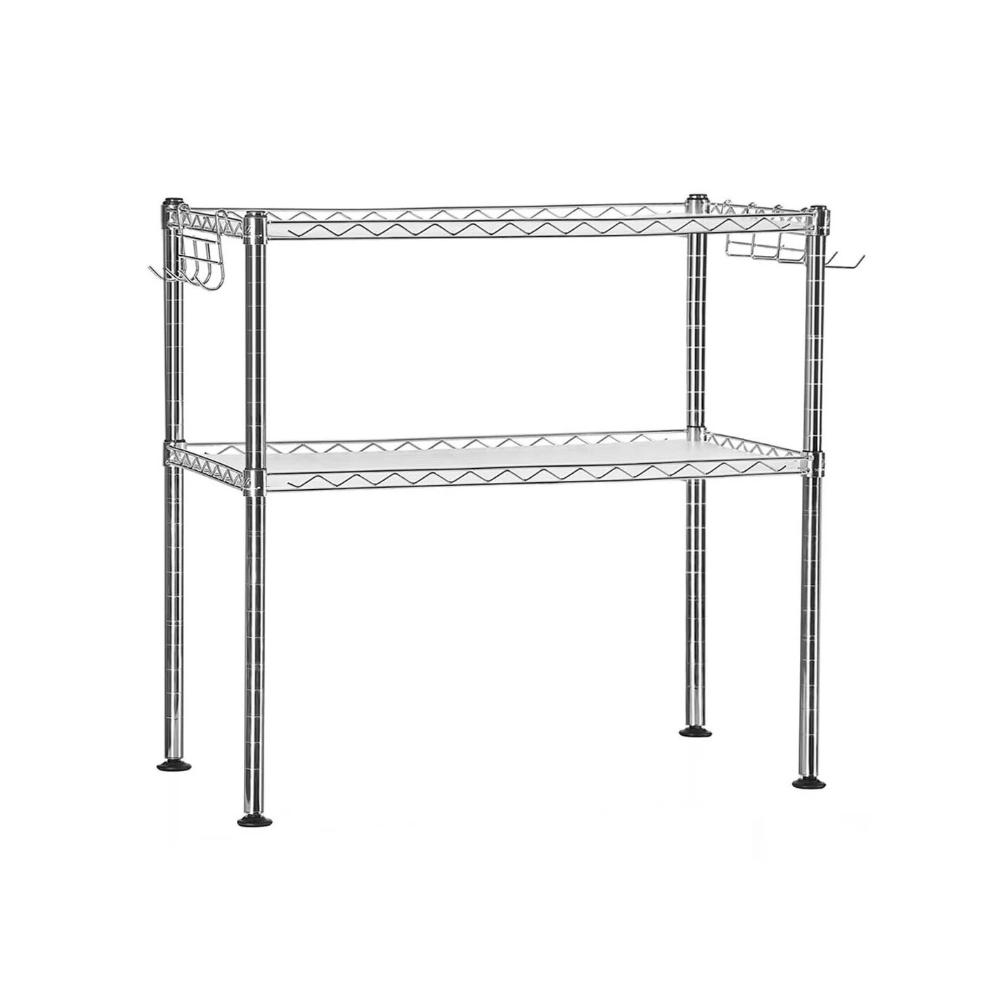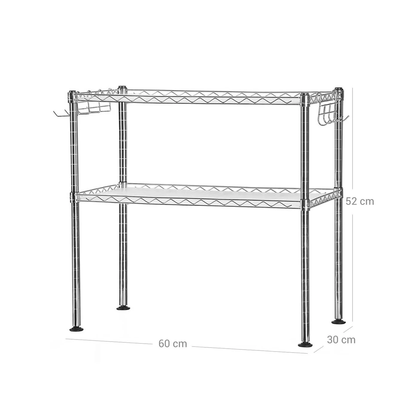 Aprašymas buvo automatiškai išverstas, gali pasitaikyti klaidų.Ši maža lentyna ypač tinka, kai mažose virtuvėse reikia papildomos sandėliavimo vietos ar sandėliavimo galimybių. Pavyzdžiui, lentynoje galima sutalpinti mikrobangų krosnelę. Pagaliau nieko neguli tiesiai ant mikrobangų krosnelės ir keletą daiktų nuo stalviršio taip pat galima rasti lentynoje, kad vėl būtų daugiau vietos.Šią nedidelę virtuvės lentynėlę taip pat galima paversti, pvz., knygoms, aplankams laikyti , kompaktiniai diskai ir tt Pastabos: - Prašome pritvirtinti kabliukus pagal surinkimo veiksmus. - Pirkdami įsitikinkite, ar dydis yra pakankamas jūsų įrenginiui.Išsami informacija apie gaminį: Matmenys: 60 x 52 x 35 cm (P x A x A) Spalva: sidabrinė Medžiaga: chromuotas geležinis vamzdis + PP plastikas Maksimali lentynos apkrova: 2,6 kg Bruto svoris: 3,2 kg Pakuotės matmenys: 62 x 32 x 6,3 cm. Pristatymo komplektacija: - 1 x virtuvės lentyna su 2 lentynomis - 1 x instrukcija (DE, EN, FR, IT, ES)
