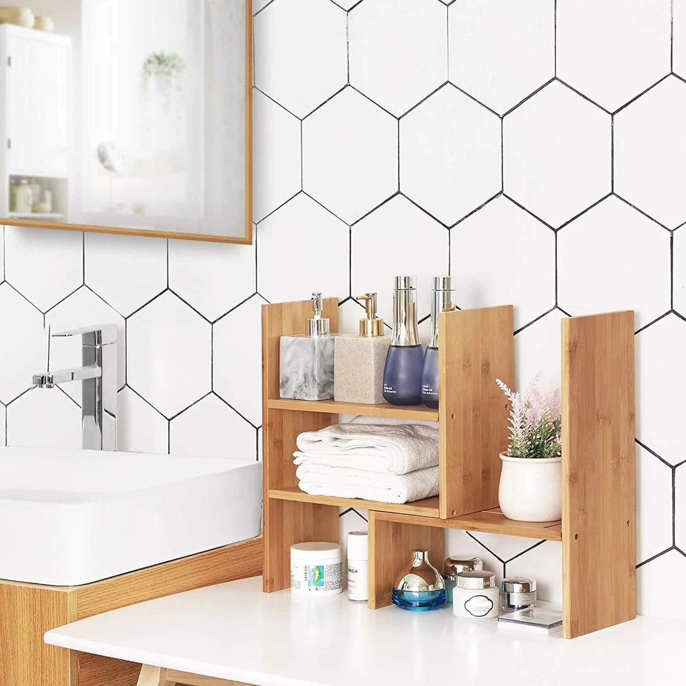 Aprašymas buvo automatiškai išverstas, gali pasitaikyti klaidų.Šis mažas, universalus SONGMICS stalo tvarkytuvas yra patogaus, kompaktiško ir erdvę taupančio dizaino, padedantis išlaikyti tvarką neužimant per daug vietos. Galite naudoti įvairių formų ir įvairiose erdvėse: svetainėje, studijoje ar biure.Dėl stalo lentynos pritaikomumo ir išplečiamumo, tai puikus priedas prie jūsų stalo tvarkyti knygas, rašiklių laikiklius, mažas vazas su augalai, nuotraukos ar kiti darbo ir mokymosi reikmenys .VoniojeDėka vandeniui atsparios bambuko medžiagos, šį tvarkyklę taip pat galima pastatyti šalia kriauklės ar vonios, kad būtų galima laikyti muilus, kvepalų buteliukus ir kremus.VirtuvėjeNaudokite lentyną savo virtuvėje laikyti prieskonius, druskos ir pipirų plakiklius, kavos puodelius, indų ploviklį, kempinėles ar pasigaminti džiovinimo rankšluosčių. Dabar jums priklauso: ką norite padaryti su šia bambukine stalo lentyna?Prekės informacija: - Spalva: natūrali - Medžiaga: bambukas - Gaminio dydis: 64,7 x 15 x 40 cm (P x G x A) - Svoris: 2,7 kg Pristatymo komplektas: - 1 x stalo tvarkyklė - 1 x aksesuarų krepšys - 1 x instrukcijos (DE , EN, FR, ES, IT)
