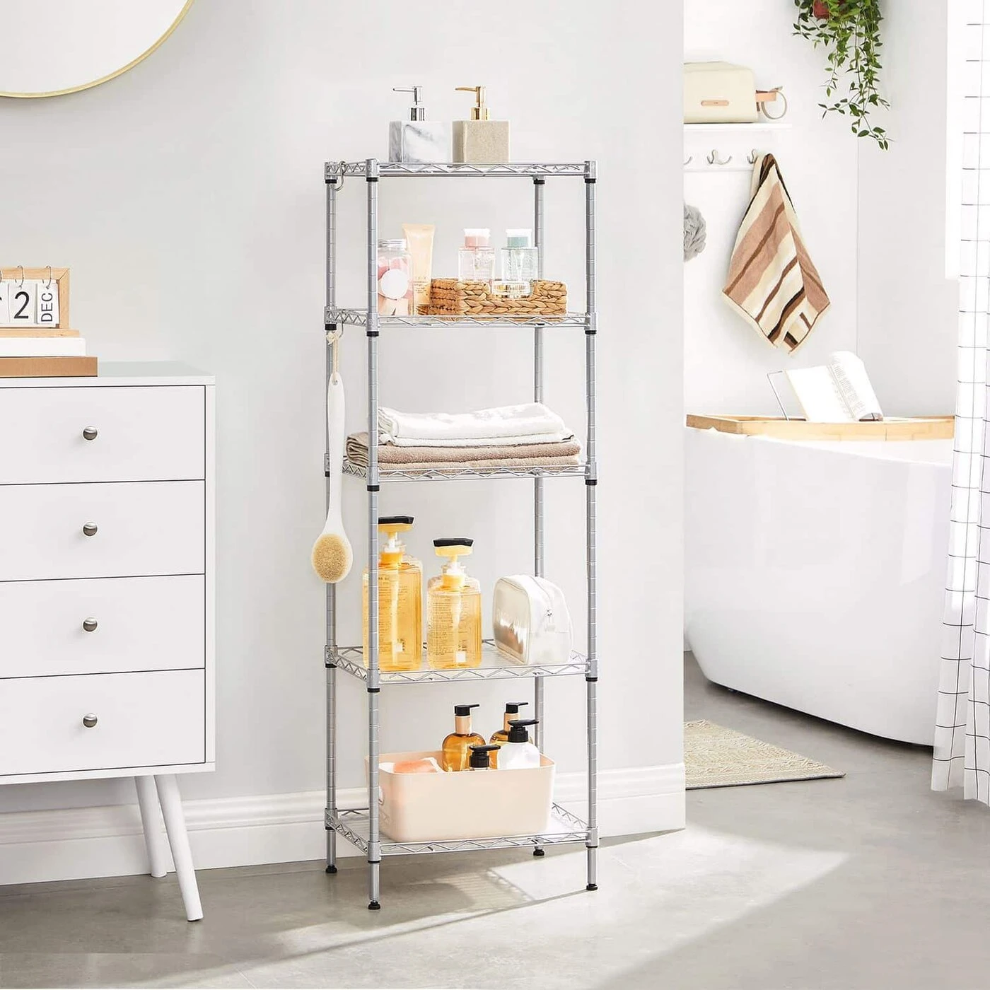 Aprašymas buvo automatiškai išverstas, gali pasitaikyti klaidų.Virtuvėje? HEROJUS: jūsų stalviršis pilnas puodų, prieskonių, dubenėlių ir kitų maisto ruošimo reikmenų, o jūs turite mažai vietos pasigaminti savo didelę vakarienę? Ši aukšta lentyna padės išbristi iš bėdų. Išdėstykite viską 5 lygiuose, nuvalykite stalviršį ir pasiruoškite nustebinti savo svečius! Vonioje? MAGAS: Rankšluosčius, šampūnus, losjonus, vonios druskas ir kitus tualeto reikmenis laikykite 5 aukštuose, o šepetėlius pakabinkite ant kabliukų – stebuklingai padidinkite kadaise perpildytą vonios kambarį! Beje: paaukštinti kraštai apsaugo Jūsų daiktus nuo kritimo.Balkone? Oazė: ant šios metalinės lentynos sukurkite balkono sodą su mėgstamais augalais ir gėlėmis. Įneškite į savo namus žalios spalvos ir sukurkite savo augalams idealią aplinką klestėti.Informacija apie gaminį: - Spalva: sidabrinė - Medžiaga: plienas - Dydis: 40 x 30 x 121 cm (P x P x A) - Svoris: 4,2 kg - Maksimali statinė apkrova vienam lentynos lygiui: 20 kg Pristatymo komplektas: - 1 x lentyna laikymui - 5 x PP plokštė - 4 x kabliukai - 1 x apsauga nuo apvirtimo - 1 x instrukcijos SONGMICS Pastabos: - Montuojant plastikinius spaustukus, rodyklė VIRŠUS visada turi būti nukreipta į viršų. Surinkę patikrinkite visus spaustukus ir įsitikinkite, kad jie daugiau nejuda. - Įsitikinkite, kad atraminiai spaustukai pritvirtinti prie 4 vamzdžių tame pačiame aukštyje, kad lentynos būtų horizontaliame lygyje. - Didžiausia statinė apkrova vienam lentynos lygis 20 kg. Neviršykite šio maksimalaus svorio. - Pritvirtinkite gaminį prie sienos su apsaugančiu įtaisu, kad užtikrintumėte saugų naudojimą.