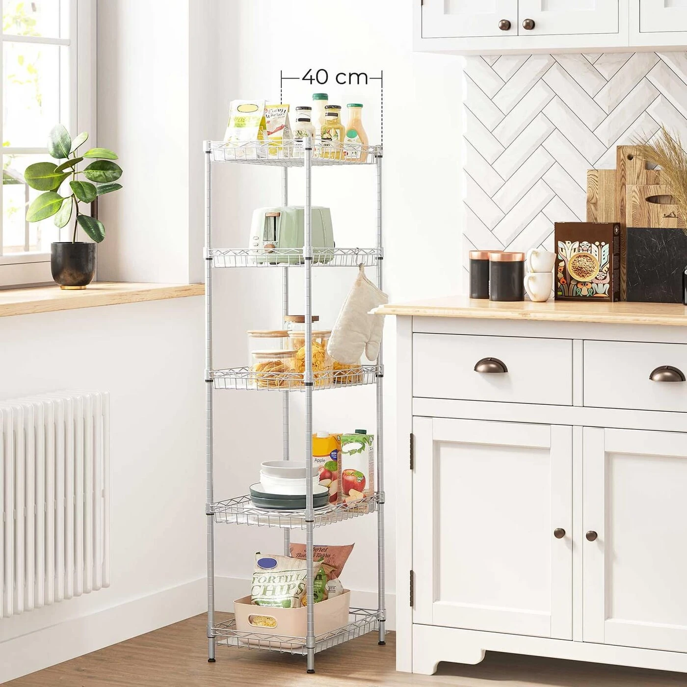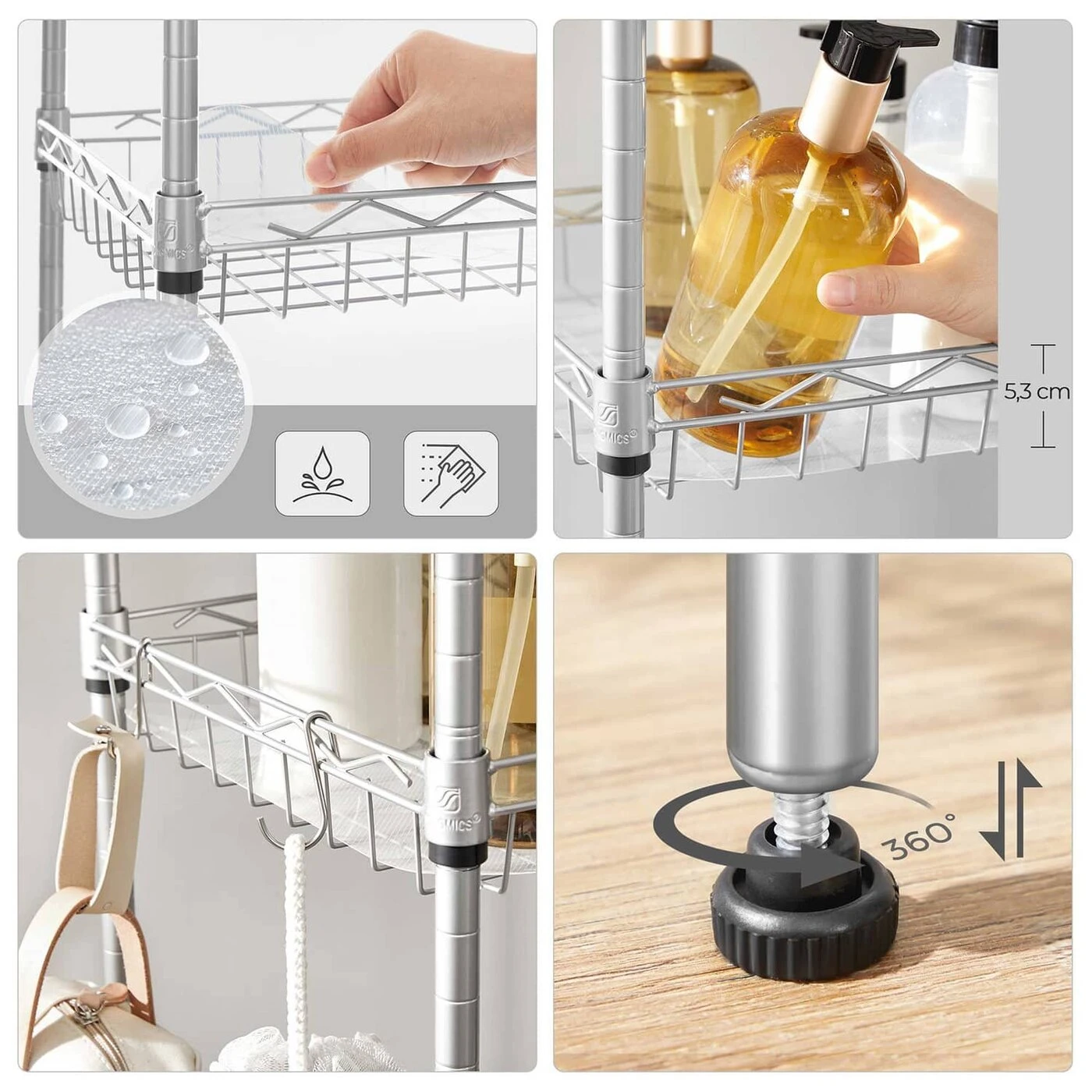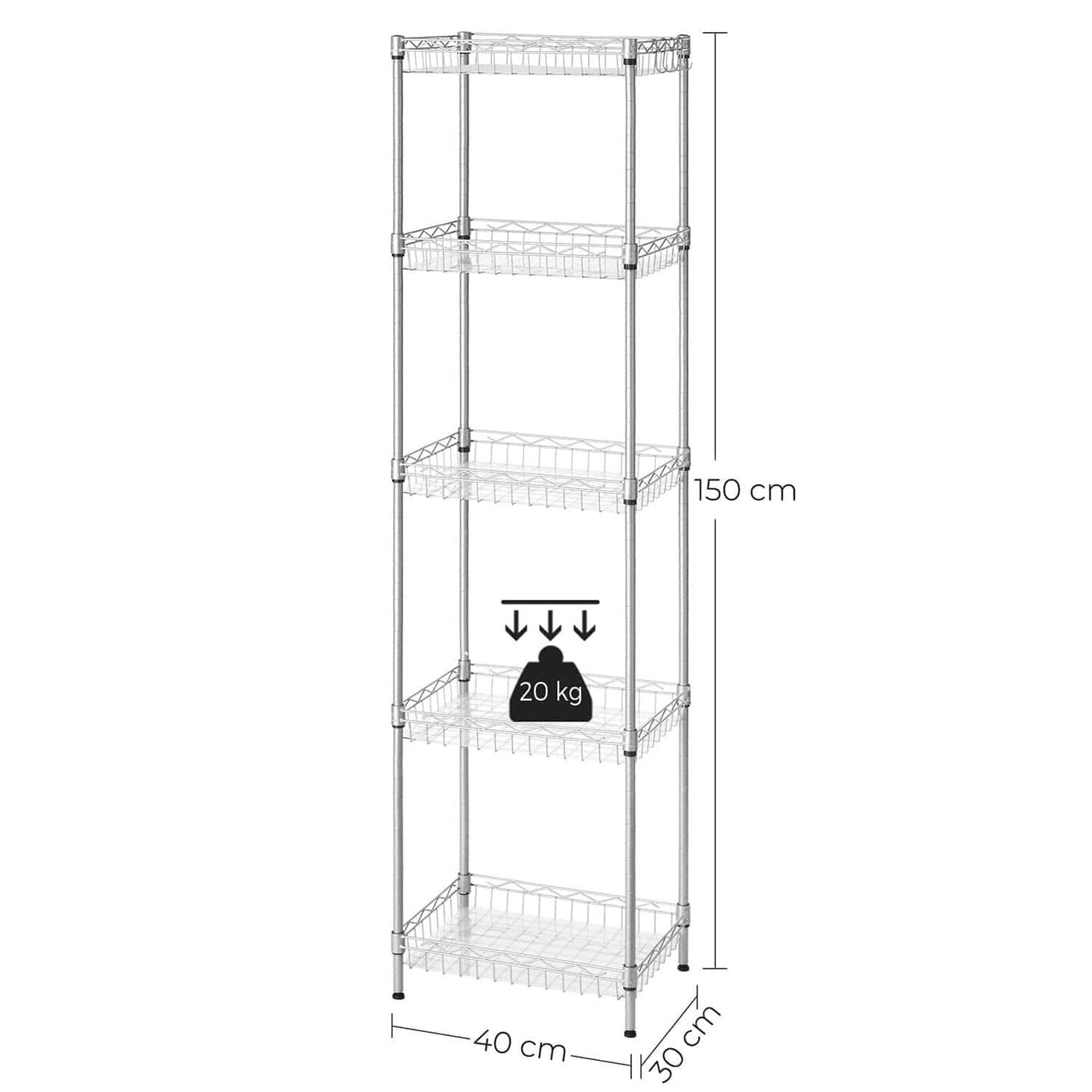 Aprašymas buvo automatiškai išverstas, gali pasitaikyti klaidų.Virtuvėje? HEROJUS: jūsų stalviršis pilnas puodų, prieskonių, dubenėlių ir kitų maisto ruošimo reikmenų, o jūs turite mažai vietos pasigaminti savo didelę vakarienę? Ši aukšta lentyna padės išbristi iš bėdų. Išdėstykite viską 5 lygiuose, nuvalykite stalviršį ir pasiruoškite nustebinti savo svečius! Vonioje? MAGAS: Rankšluosčius, šampūnus, losjonus, vonios druskas ir kitus tualeto reikmenis laikykite 5 aukštuose, o šepečius pakabinkite ant kabliukų – stebuklingai padidinsite kadaise sausakimšą vonios kambarį! Beje: vielinio krepšelio dizainas apsaugo jūsų daiktus nuo kritimo. Balkone? Oazė: ant šios metalinės lentynos sukurkite balkono sodą su mėgstamais augalais ir gėlėmis. Įneškite į savo namus žalios spalvos ir sukurkite savo augalams idealią aplinką klestėti.Informacija apie gaminį: - Spalva: sidabrinė - Medžiaga: plienas - Dydis: 40 x 30 x 150 cm (P x P x A) - Svoris: 4,7 kg - Maksimali statinė apkrova vienam lentynos lygiui: 20 kg Pristatymo apimtis: - 1 x lentyna laikymui - 5 x PP plokštė - 4 x kabliukai - 1 x apsauga nuo apvirtimo - 1 x instrukcijos SONGMICS Pastabos: - Montuojant plastikinius spaustukus, rodyklė VIRŠUS visada turi būti nukreipta į viršų. Surinkę patikrinkite visus spaustukus ir įsitikinkite, kad jie daugiau nejuda. - Įsitikinkite, kad atraminiai spaustukai pritvirtinti prie 4 vamzdžių tame pačiame aukštyje, kad lentynos būtų horizontaliame lygyje. - Didžiausia statinė apkrova vienam lentynos lygis 20 kg. Neviršykite šio maksimalaus svorio. - Pritvirtinkite gaminį prie sienos su apsaugančiu įtaisu, kad užtikrintumėte saugų naudojimą.