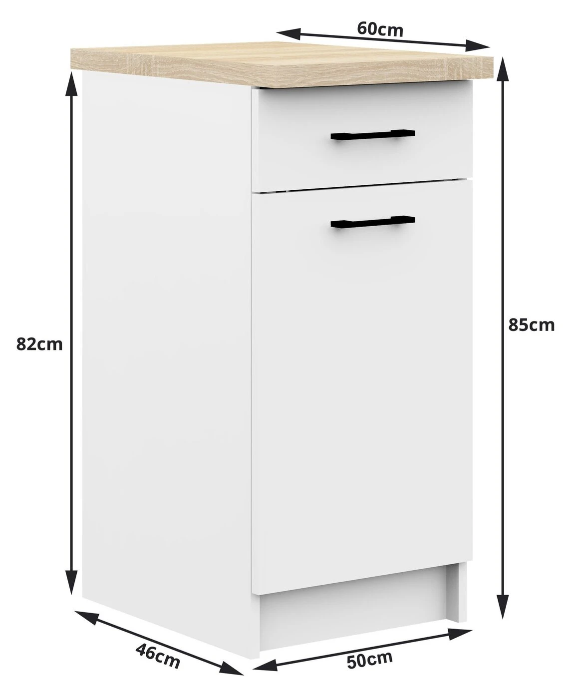 Aprašymas buvo automatiškai išverstas, gali pasitaikyti klaidų. Nesenstančios ir labai universalios baltos spalvos virtuvės spintelė. Šiuolaikinės matinės juodos spalvos rankenos užtikrina ilgą ir be rūpesčių naudojimą. Spintelė S50 1D 1S turi talpų stalčių virtuvės reikmenims ir dureles, o viduje – lentynėlę, kurioje tilps kuo daugiau papildomų virtuvės reikmenų. Pridedamas spintelei skirtas stalviršis į įsigytą spintą. Stalviršis pagamintas iš laminuotos plokštės, jo matmenys yra 50 cm / 60 cm