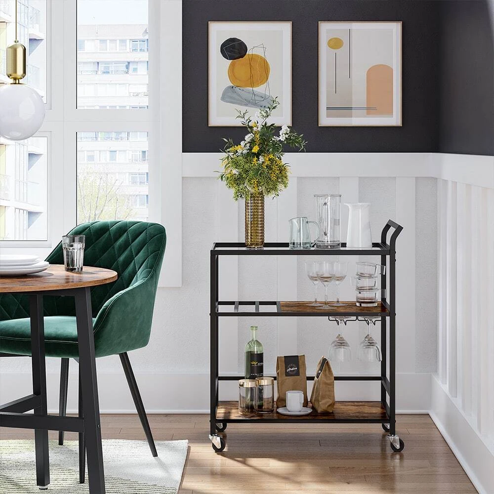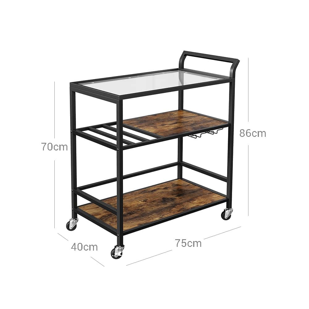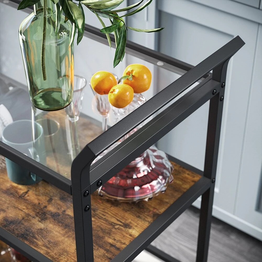 Aprašymas buvo automatiškai išverstas, gali pasitaikyti klaidų.Tegul vakarėlis prasideda! Gėrimai, užkandžiai... Sudėkite visas gėrybes į šį vežimėlį. Jūsų svečiai bus sužavėti! Pietūs patiekiami! Lengvai perneškite indus, lėkštes ir stalo įrankius į valgomąjį, kad pasidarytumėte stalą šeimos valgiui. Koks akį traukia Stiklinis viršus šiam vežimėliui suteikia žavesio. Su lenkta rankena šis serviravimo vežimėlis paverčia jūsų namus 5 žvaigždučių viešbučiu.Išsami informacija apie gaminį: Spalva: vintažinė ruda-juoda Medžiaga: medžio drožlių plokštės, plienas Dydis: 75 x 40 x 86 cm (P x P x A) Svoris: 12,3 kg Didžiausia statinė apkrova vienai lentynai: 30 kg Maksimali bendra statinė apkrova: 60 kg pristatymas: 1 x serviravimo vežimėlis 1 x priedų paketas 1 x Instrukcijos (DE, EN, IT, FR, ES)VASAGLE Pastabos: Saugumo sumetimais vaikams draudžiama lipti ant gaminio ar žaisti su juo. Didžiausia statinė apkrova Produktas sveria 60 kg. Prašome neviršyti šio didžiausio svorio.