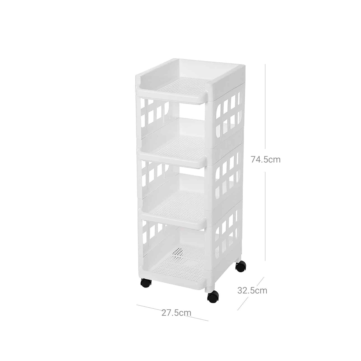 Aprašymas buvo automatiškai išverstas, gali pasitaikyti klaidų.Šis iš PP plastiko pagamintas vežimėlis yra vizualiai patrauklus elegantiškai baltai ir praktiškas 4 lentynose, puikiai tinka įvairioms progoms. Dėl 4 universalių ratukų jis užtikrina puikų lankstumą/mobilumą, leidžiantį sukurti tvarkingą ir greitą prieigą prie reikalingų daiktų. Išsami informacija apie gaminį: - Spalva: balta - Medžiaga: PP plastikas - Gaminio matmenys: 27,5 x 74,5 x 32,5 cm (P x A x G) - Atstumas: 21 cm - Svoris: 1,95 kg - Keliamoji galia: 20 kgPristatymo apimtis: - 1 x vežimėlis - 1 x rankinis (DE, EN, FR, ES, IT) Pastabos: - Nedėkite ant gaminio jokių sunkių daiktų. Kad gaminys tarnautų ilgą laiką, nemontuokite ir neišardykite šio gaminio kelis kartus - Gaminį reikia saugoti nuo šilumos šaltinių.