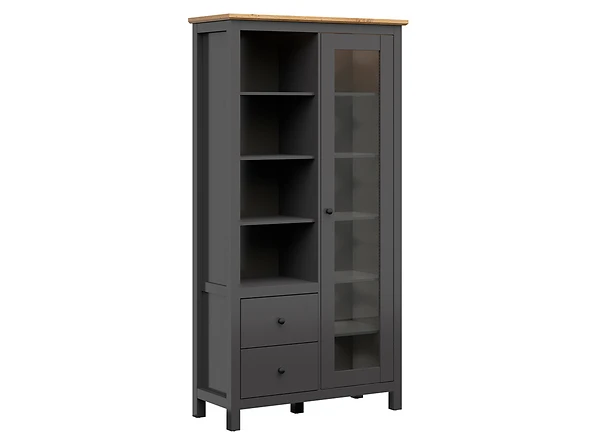 Skandinaviško stiliaus baldų sistema lengvai derinama skirtingo stiliaus interjere. Vitrinos spalvas galima rinktis iš dviejų spalvų: šviesus sibiu maumedis / lariko pušis arba grafitas / ąžuolas. Vitrinos viduje įmontuotos lemputės, apšvies lentynos vidų ir tuo pat metu suteiks jaukumo bendrai svetainės erdvei.