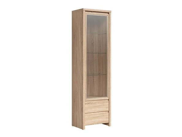 Modernaus dizaino vitrina su talpiais stalčiais, uždaromis lentynomis ir stiklu.
