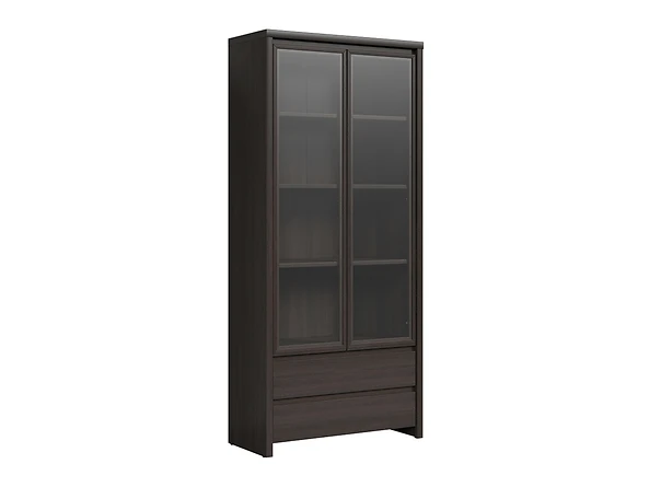 Modernaus dizaino dviejų durų vitrina su talpiais stalčiais, uždaromis lentynomis ir stiklu.