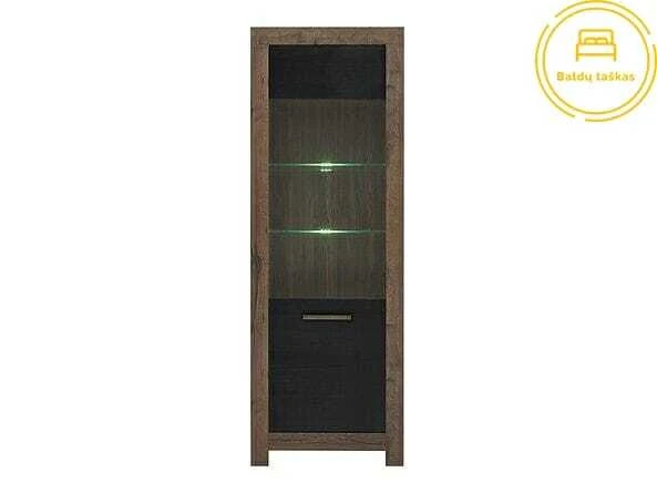 Modernaus dizaino vitrina su uždaromis lentynomis, apšviestomis LED lemputėmis.