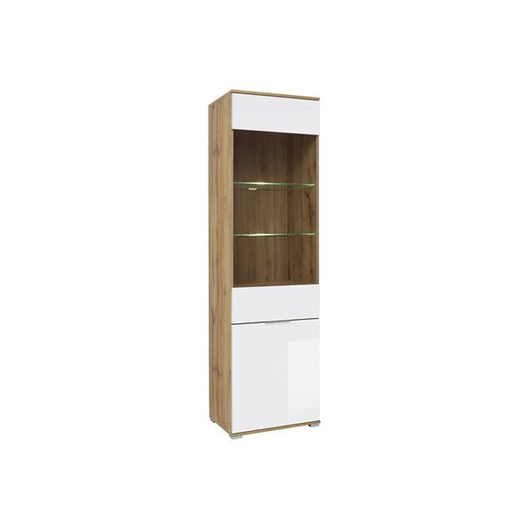 Modernaus dizaino vitrina ZLATA su talpiomis lentynomis ir stiklu.