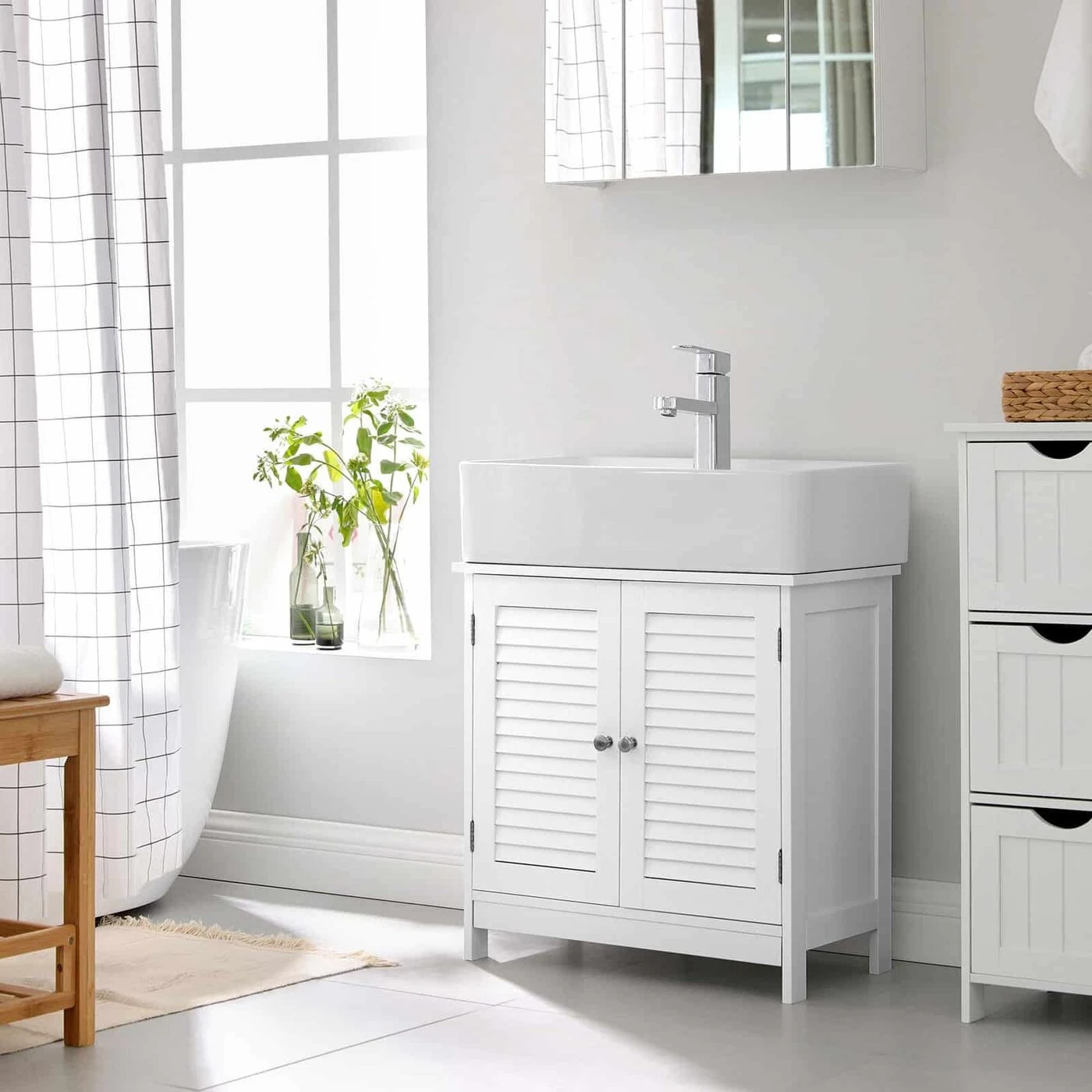 Aprašymas buvo automatiškai išverstas, gali pasitaikyti klaidų.SOS vonios baldai Ar jūsų rankšluosčiai guli visur vonios kambaryje? Ar vis užkliūva už dušo želė buteliukų ant grindų? Pavargote žaisti slėpynių su plaukų džiovintuvu? Šioje vonios spintelėje, kurioje yra 3 lygių reguliuojama lentyna, tvarkingai laikykite visus indus. VASAGLE labai palengvina jūsų gyvenimą! Puiki kokybė Ši kosmetinė spintelė turi 2 blizgančias rankenas ir 2 spintelės dureles, kurios dėl kruopštaus apdailos sandariai užsidaro. Jūsų svečiai netgi gali jūsų paklausti, kur įsigijote tą spintelę, nes dabar jos trūksta!Informacija apie gaminį: - Spalva: Matinė balta - Medžiaga: E1 klasės MDF (vidutinio tankio medienos plaušų plokštė) - Dydis: 60 x 30 x 60 cm (P x P x A) - Sifono angos dydis: 20 x 15 cm - Svoris: 9,5 kg - Maksimali statinė apkrova iš viso: 10 kg Pristatymo komplektacija: - 1 x kosmetinis komplektas - 1 x priedų paketas - 1 x vadovas (DE, EN, FR, ES, IT) VASAGLE Pastabos: - Saugumo sumetimais, vaikams draudžiama lipti ant gaminio ar žaisti su juo.- Maksimali gaminio statinė apkrova yra 10 kg. Neviršykite šio didžiausio svorio.- Atkreipkite dėmesį, kad sifono vamzdžio išleidimo angos dydis yra 20 x 15 cm (P x P). Prieš pirkdami šį gaminį, atidžiai išmatuokite savo kriauklę.
