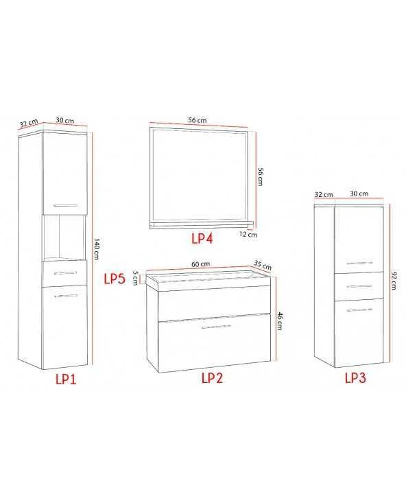 | LP1 - aukštas korpusas (30/140/32)LP2 - Praustuvo spintelė (60/46/35)LP3 - žemas korpusas (30/92/32)LP4 - Vonios kambario veidrodis (56/56/12) | ||