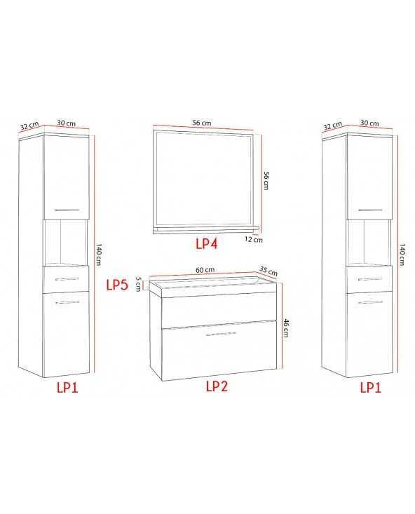 | LP1 - Aukšta spintelė (30/140/32) 2vnt.LP2 - Praustuvo spintelė (60/46/35)LP4 - Vonios kambario veidrodis (56/56/12) | ||