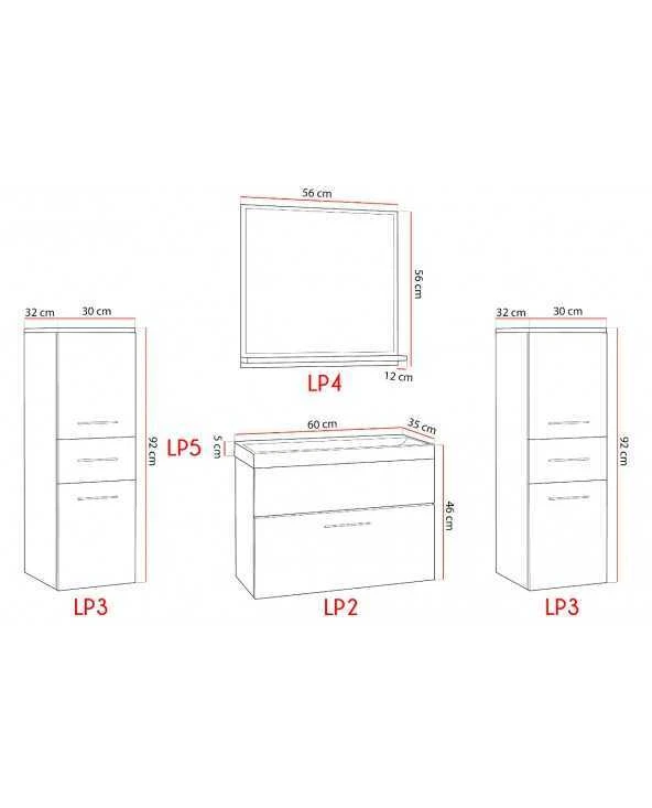 | LP2 - Praustuvo spintelė (60/46/35)LP3 - žema spintelė (30/92/32) 2vnt.LP4 - Vonios kambario veidrodis (56/56/12) | ||