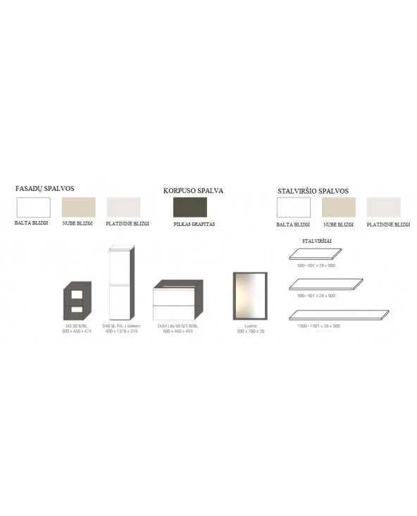Fasadas baltas blizgus (Nube, platininis). Korpusas pilkas grafitas. Stalviršis blizgus, fasadų spalvos.