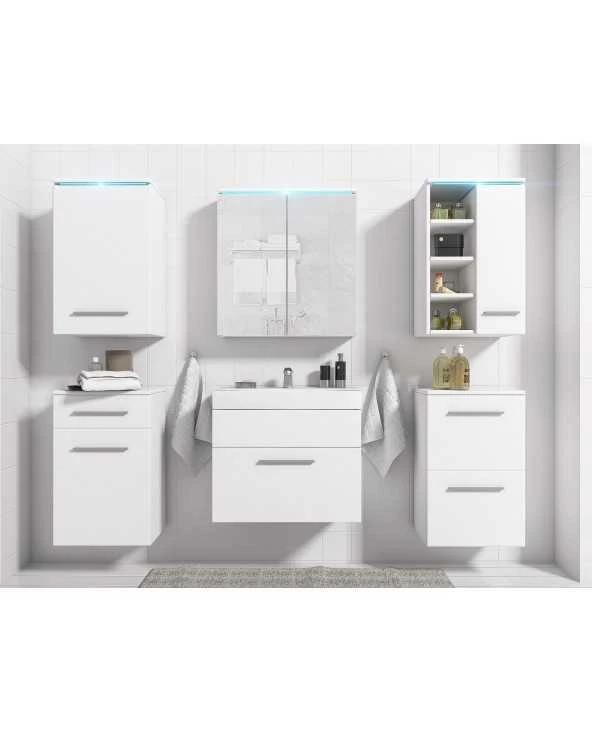 | - Kairė viršutinė spintelė (40/64/32)- Veidrodinė spintelė (60/64/15)- Viršutinė dešinioji spintelė (40/64/32)- Apatinė spintelė, kairė (40/64/32)- Praustuvo spintelė (60/51/35)- Pagrindinė spintelė, dešinė (40/64/32) | ||