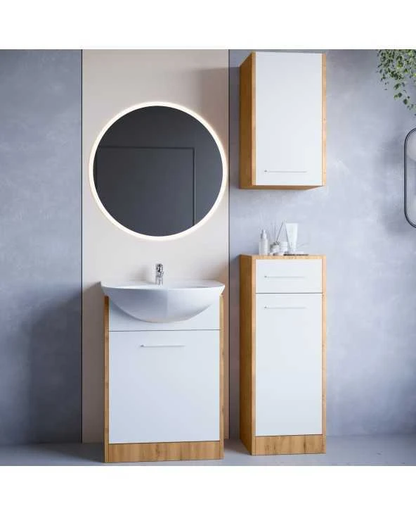 | Baldus galima įsigyti komplektais ir atskiromis dalimis.Spintelės turi universalias dureles ir stalčius ant metalinių kreipiančiųjų.Praustuvo spintelės durelės atsidaro žemyn.Baldai tvirtai supakuoti į pakuotes, skirtas savarankiškam surinkimui.Veidrodis turi jutiklinį jungiklį. | ||