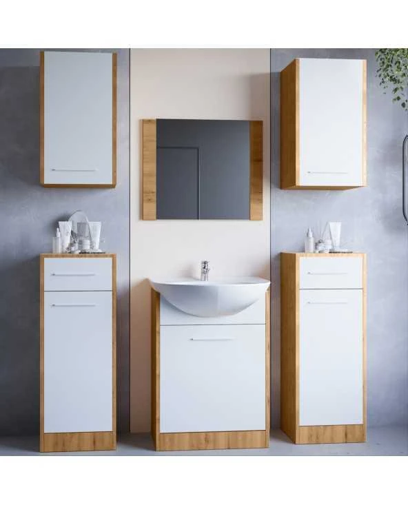| Baldus galima įsigyti komplektais ir atskiromis dalimis.Spintelės turi universalias dureles ir stalčius ant metalinių kreipiančiųjų.Praustuvo spintelės durelės atsidaro žemyn.Baldai tvirtai supakuoti į pakuotes, skirtas savarankiškam surinkimui. | ||