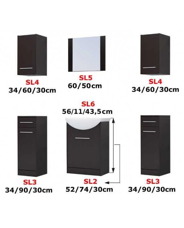 | SL2 - Praustuvo spintelė (52/74/30)SL3 - Žemas korpusas (34/90/30) 2vnt.SL4 - Sieninė spintelė (34/60/30) 2 vnt.SL5 - Veidrodis (60/50/) | ||