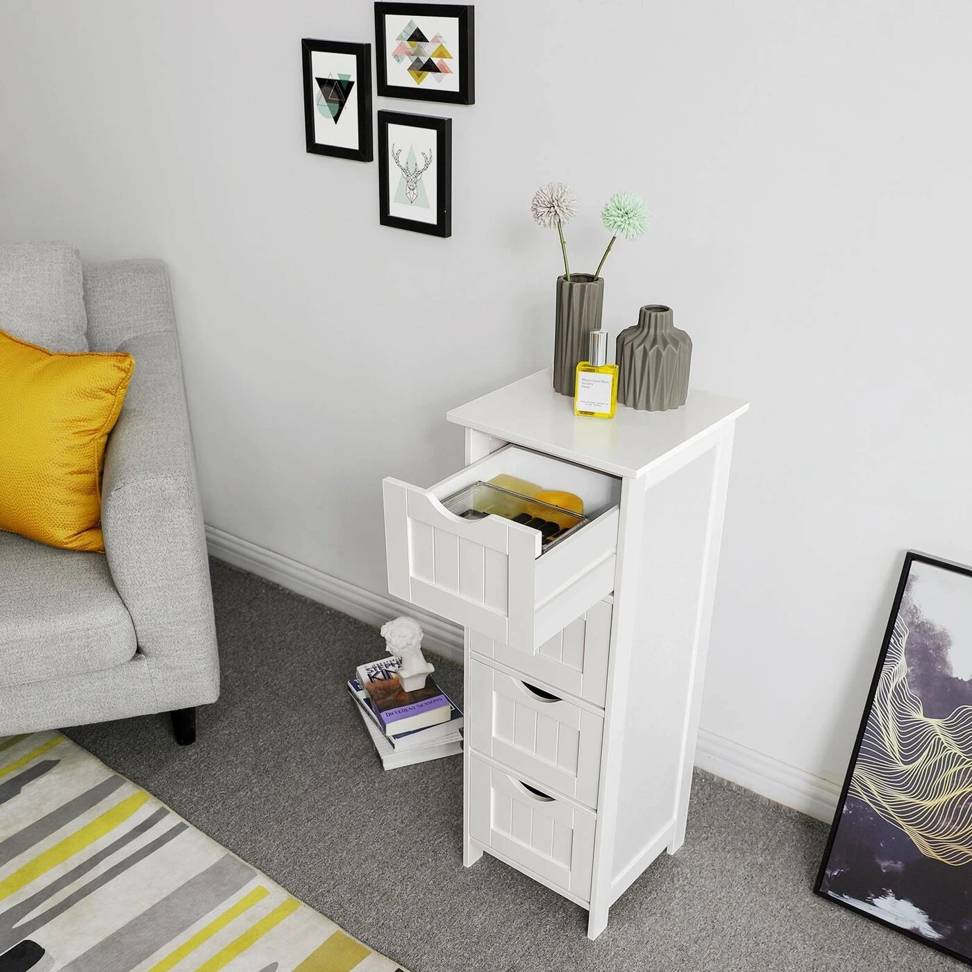 Aprašymas buvo automatiškai išverstas, gali pasitaikyti klaidų.VASAGLE šoninė spintelė įtikina savo funkcionaliu dizainu ir stabiliu atlikimu. Jame yra pakankamai vietos jūsų indams dekoruojant jūsų gyvenamąją erdvę. Stalčius lengva ištraukti.Šis idealus laikiklis praturtins jūsų namus ir traukia akį!Prekės detalės: - Matmenys: 30 x 82 x 30 cm (P x A x G) - Spalva: balta - Medžiaga: MDF plokštė - Pakuotės matmenys: 92 x 37 x 11,5 cm - Grynasis svoris: 8,65 kg - Bruto svoris: 10 . 04 kg Pristatymo komplektas: - 1 x šoninė spintelė - 1 x instrukcijos (DE, EN, FR, IT, ES) - 1 x jungiamųjų detalių krepšys (atsuktuvas neįeina)