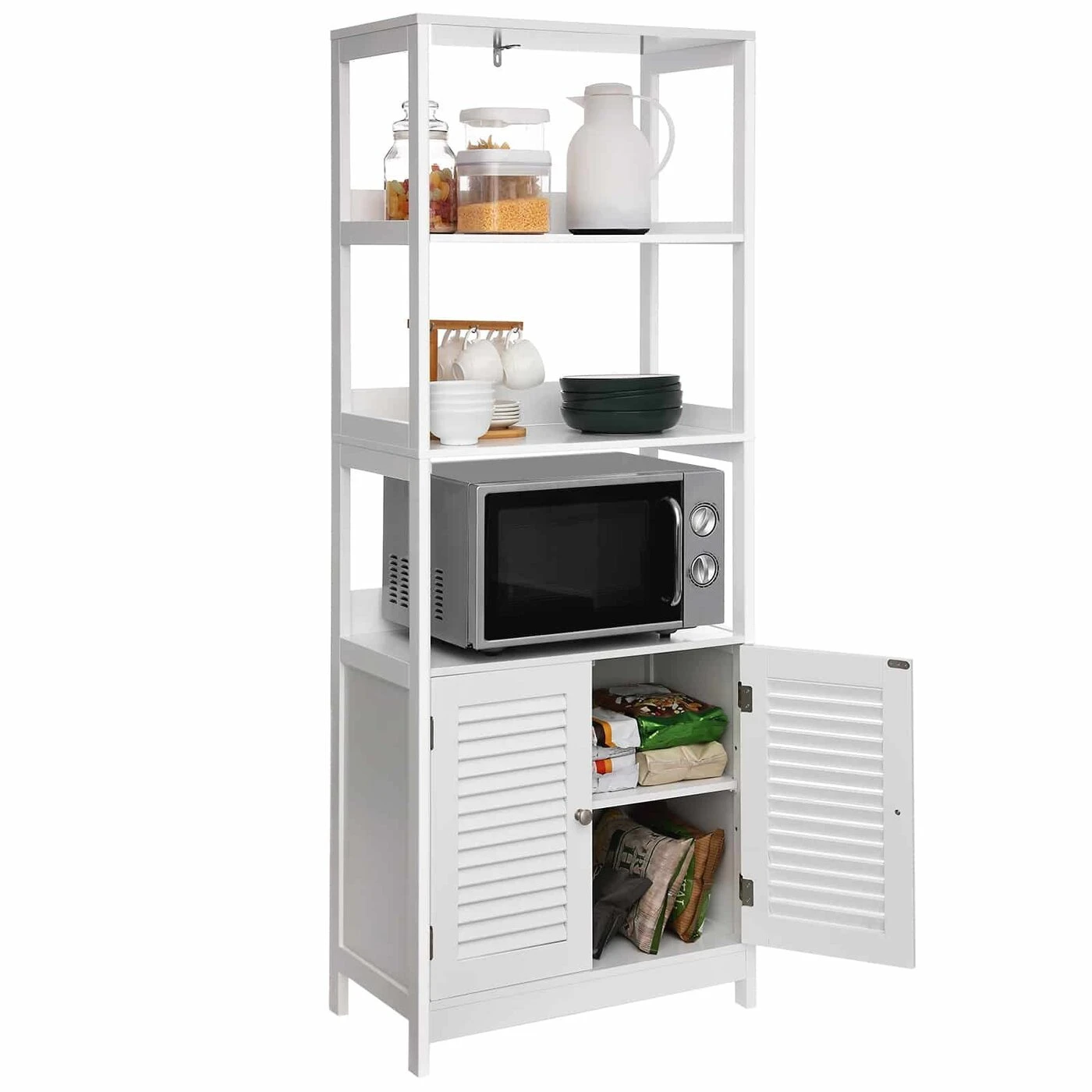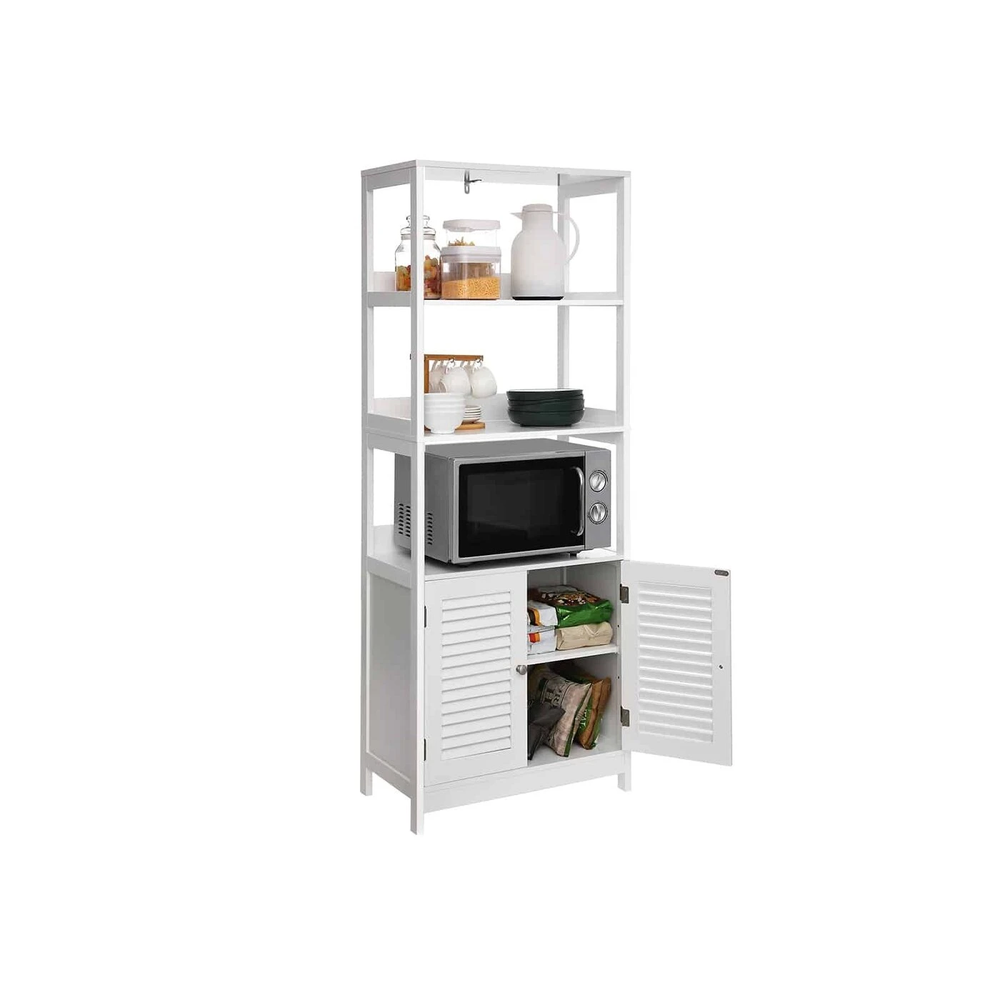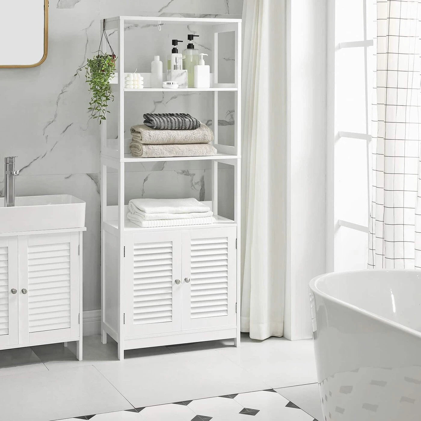 Aprašymas buvo automatiškai išverstas, gali pasitaikyti klaidų.Nėra nieko tokio, kaip po karštos vonios su burbuliukais įsisupti į jaukų rankšluostį ir pasitepti kvapniu losjonu. Šioje spintelėje rasite pakankamai vietos jūsų būtiniausioms maudymosi reikmėms. Įvairios laikymo galimybės Tualeto reikmenys ir vonios druskos puikiai dera ant atvirų lentynų. Valymo priemones ir kitus daiktus geriau paslėpti už dvigubų durų. Taip pat ant viršutinės lentynos pastatykite kvapnią žvakę, kad suteiktumėte vonios kambariui romantišką atmosferą. Tikras universalusDaugiau nei tik vonios spintelė! Šis baldas taip pat tinka jūsų virtuvėje mikrobangų krosnelei ir puodams laikyti, o svetainėje - knygoms ir paveikslų rėmams. Arba naudokite šią spintelę koridoriuje, kad galėtumėte lengvai pasiekti raktus ir pinigines. Koks jūsų planas?Išsami gaminio informacija:- Spalva: Matinė balta- Medžiaga: E1 klasės MDF (vidutinio tankio medienos plaušų plokštė)- Dydis: 60 x 32,5 x 154 cm (P x P x A)- Svoris: 20,3 kg- Maks. Bendra statinė keliamoji galia: 20 kgPristatymo apimtis: - 1 x vonios spintelė - 1 x priedų paketas - 1 x apsauga nuo apvirtimo - 1 x rankinis (DE, EN, FR, ES, IT) VASAGLE Pastabos: - Pritvirtinkite šį gaminį prie sienos su pridedamu anti- - Saugaus naudojimo užtikrinimas - Saugumo sumetimais vaikams draudžiama lipti ant gaminio ar žaisti su juo. - Jei norite pastatyti mikrobangų krosnelę ant šios lentynos, pirmiausia turite ją išmatuoti, kad įsitikintumėte, jog mikrobangų krosnelė veiks. tinka.