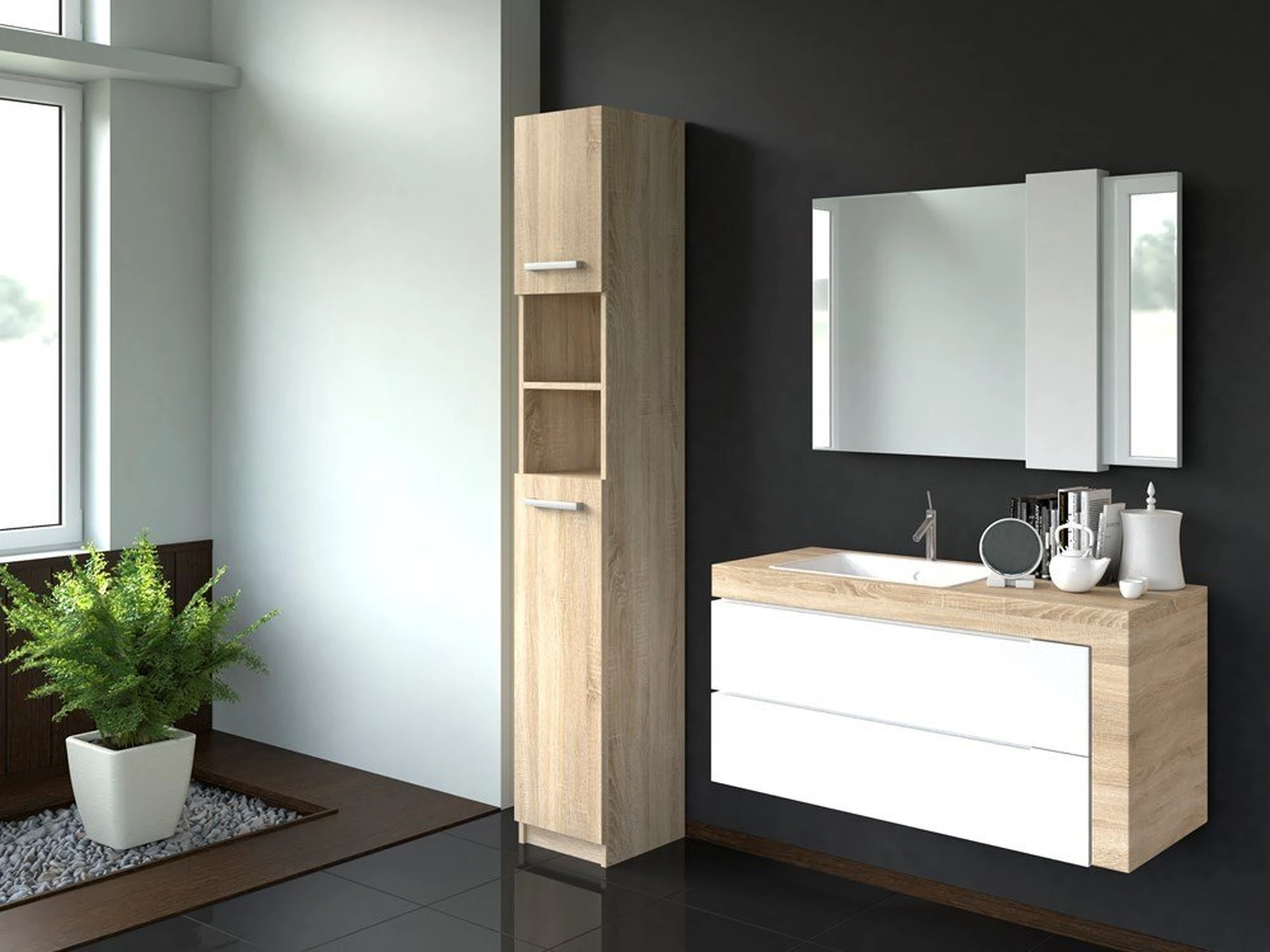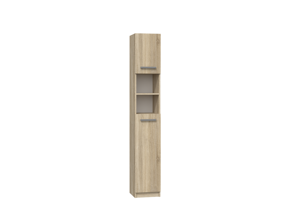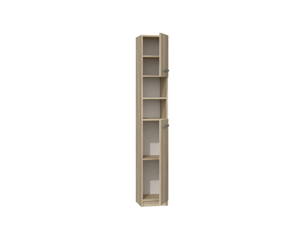 Spintelės išmatavimai: aukštis - 183 cm, plotis – 32 cm, gylis – 30 cm. Korpusas ir fasadas pagamintas iš laminuotos medžio drožlių plokštės (MDP). Šonai padengti ABS plastiku, kuris pasižymi aukštu mechaniniu ir cheminiu atsparumu. Spalva: ąžuolo (sonoma oak). Rankenėlės plastikinės, sidabro spalvos. Spintelės universalus dizainas tiks tiems, kas vertina paprastumą ir eleganciją. Dėl minimalistinio stiliaus rankenėlių patogiai pasieksite spintelės turinį. Surinkimo metu galima pasirinkti durelių atsidarymo pusę - kairę ar dešinę.