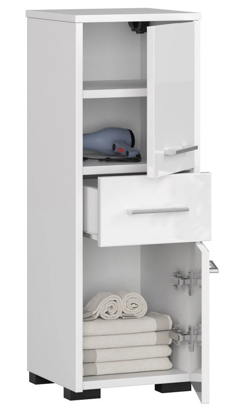 Aprašymas buvo automatiškai išverstas, gali pasitaikyti klaidų. Vonios kambarys yra vieta, kur labai svarbu tvarkyti daiktus. Šią problemą nesunkiai išsprendžia funkcionalūs baldai, pavyzdžiui, vonios lentynos. Mūsų pasiūlyme pateikiamas spintelė-stulpelis FIN 2D 1SZ vonios stelažas pagamintas iš laminuotos plokštės, pagamintos Kronospan, 16 mm storio. Kraštai apdailinti ABS apvadu. Visa tai daro spintelę atsparią įbrėžimams ir mechaniniams pažeidimams. Stulpas yra labai universalus baldas. Į komplektą įeina ir reguliuojamos pakabos, ir kojelės spintelei pastatyti ant žemės. Apatinė lentynos dalis yra vienoda, uždara erdvė, kurioje galima sėkmingai laikyti rankšluosčius. Tačiau viršutinių durų viduje yra viena lentyna, kurioje galite atskirti kosmetiką. Centrinę stulpelio dalį užima ištraukiamas stalčius. Spintelės durys puoštos sidabrinėmis rankenomis. Savybės: spintelė FIN 2D 1SZ vonios stovas pagamintas iš balto blizgesio spintelė, skirta montuoti savarankiškai Instrukcijos pridedamos Garantija 24 mėnesiai