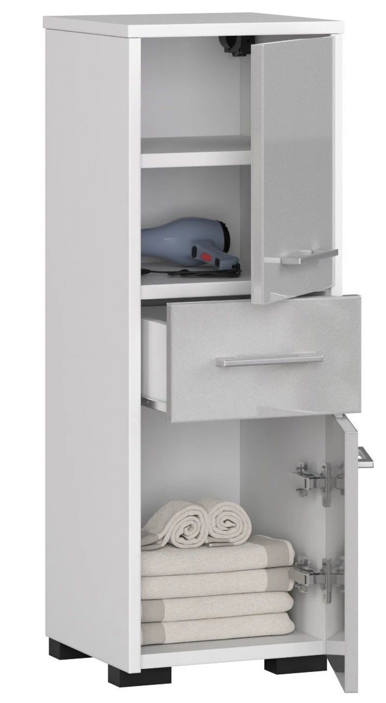 Aprašymas buvo automatiškai išverstas, gali pasitaikyti klaidų. Vonios stulpelis FIN su stalčiumi ir dviem varstomais durimis pagamintas iš kokybiškos, atsparios dilimui Kronospan laminuotos baldų plokštės., baltos spalvos baldo korpusas puikiai dera su fasadais su blizgia metalo spalvos akrilo danga. Po stulpo viršumi yra spintelė su dviem lentynomis ir durelėmis. Žemiau yra stalčius, o apačioje – dar viena spintelė – šį kartą su viena lentyna. Elegantišką vonios spintelę papildo įdomios, patogios ir paprastos rankenos. Didžiausi vonios spintelės FIN privalumai: kompaktiški baldo matmenys – spintelė yra 30 cm pločio, 85 cm aukščio ir 30 cm gylio; diferencijuota sandėliavimo vieta – 3 lentynos už durų ir stalčius; dviejų spalvų apdaila, užtikrinanti įdomų dizainą ir didesnes išdėstymo galimybes; stalčių metaliniai ritinėliai; matomų kraštų apsauga ABS plastiku; galimybė naudoti kaip stovinčią spintelę arba kaip baldo pakabą; spintelė pagaminta pagal gamintojo vonios sistemą (FIN) – leidžia bet kokį derinimą su kitais toje pačioje sistemoje gaminamais baldais; savaiminio surinkimo sistema; 24 mėnesių gamintojo garantija. FIN, baltos spalvos ir metalinis vonios stulpelis yra modernus baldas, tačiau dėl jo universalus funkcionalumas, nedideli matmenys ir galimybė pakabinti arba pastatyti ant grindų. Puikiai atrodys tiek mažuose, tiek dideliuose vonios kambariuose, dekoruotuose, baltos spalvos, pilka ar madingiausiomis juodomis spalvomis šį sezoną.
