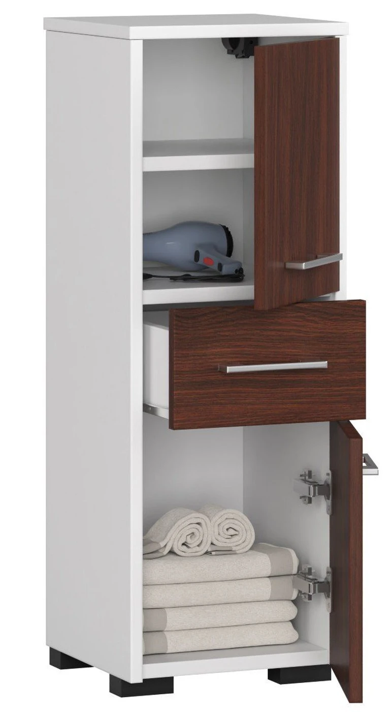 Aprašymas buvo automatiškai išverstas, gali pasitaikyti klaidų. Spintelė - stulpelis FIN 2D 1SZ vonios kabykla yra modernus ir elegantiškas baldas, padėsiantis palaikyti tvarką vonios kambaryje. Jį sudaro stalčius ir dvi spintelės, kuriose galėsite paslėpti rankšluosčius, kosmetiką ir kitus su asmenine higiena susijusius reikmenis. Baldai pasižymi ilgaamžiškumu ir tvirtu apdirbimu. Nors ir paprastos formos, išsiskiria savo spalvomis – baltos ir, tamsiai ruda spalvos deriniu. Durų rankenos yra sidabrinės spalvos. Vonios stulpai yra funkcionalūs ir naudingi baldai. FIN 2D 1SZ knygų spinta turi papildomų privalumų: ilgaamžiškumas – baldai pagaminti iš kokybiškos laminuotos plokštės, kurios storis 16 mm, atsparumas pažeidimams - stelažo kraštai faneruoti ABS apvadu, talpa - yra stalčius ir dvi lentynos, moderni išvaizda ir įdomu spalvos lengvas surinkimas - užsakymas pateikiamas su instrukcija, universalumas - komplekte yra reguliuojamos pakabos ir kojelės spintelei pastatyti ant grindų, palanki kaina ir 24 mėnesių garantija.