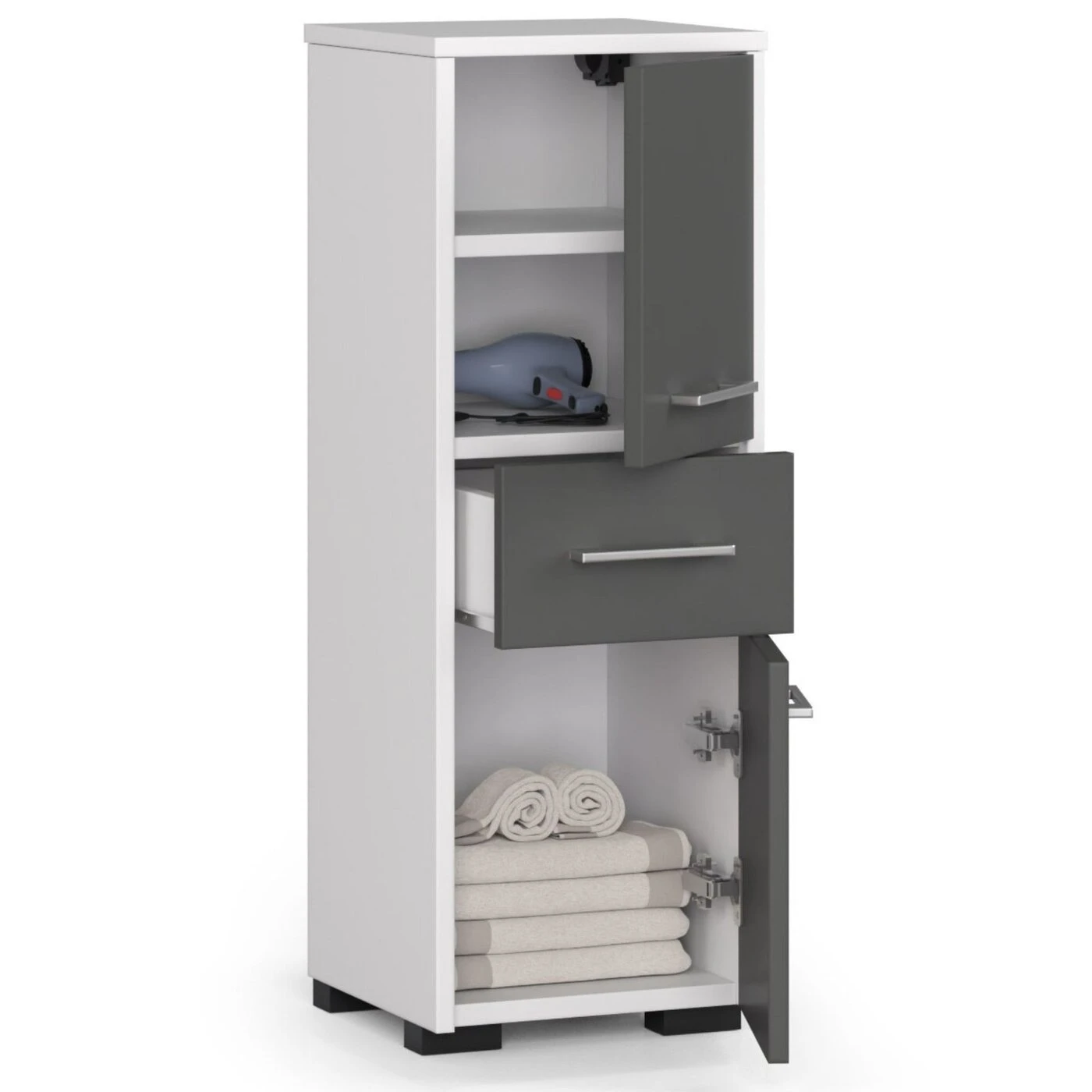 Aprašymas buvo automatiškai išverstas, gali pasitaikyti klaidų. Spintelė - stulpelis FIN 2D 1SZ vonios kabykla yra modernus ir elegantiškas baldas, padėsiantis palaikyti tvarką vonios kambaryje. Jį sudaro stalčius ir dvi spintelės, kuriose galėsite paslėpti rankšluosčius, kosmetiką ir kitus su asmenine higiena susijusius reikmenis. Baldai pasižymi ilgaamžiškumu ir tvirtu apdirbimu. Nors ir paprastos formos, išsiskiria savo spalvomis – baltos ir grafito pilkos spalvos deriniu. Durų rankenos yra sidabrinės spalvos. Vonios stulpai yra funkcionalūs ir naudingi baldai. FIN 2D 1SZ knygų spinta turi papildomų privalumų: ilgaamžiškumas – baldai pagaminti iš kokybiškos laminuotos plokštės, kurios storis 16 mm, atsparumas pažeidimams - stelažo kraštai faneruoti ABS apvadu, talpa - yra stalčius ir dvi lentynos, moderni išvaizda ir įdomu spalvos lengvas surinkimas - užsakymas pateikiamas su instrukcija, universalumas - komplekte yra reguliuojamos pakabos ir kojelės spintelei pastatyti ant grindų, palanki kaina ir 24 mėnesių garantija.