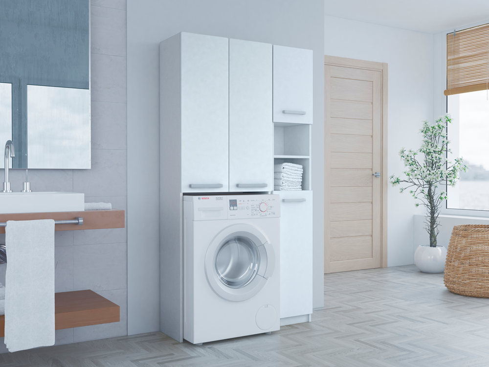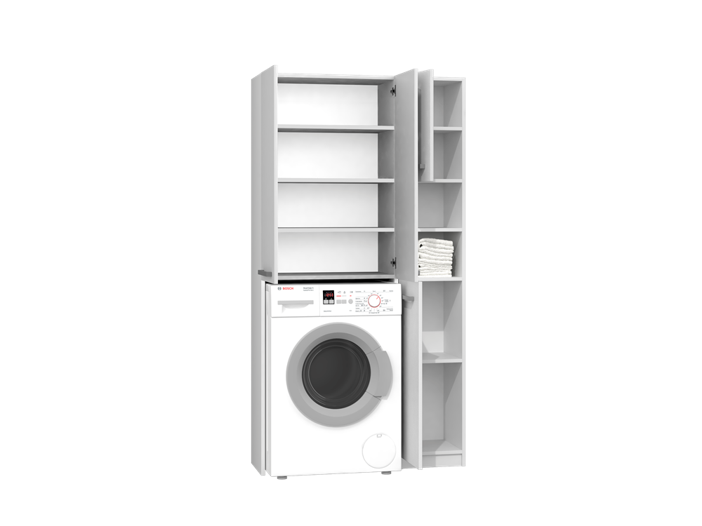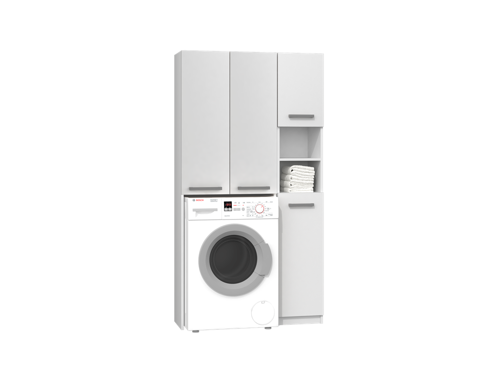 Praktiškas vonios spintelių rinkinys;Spintelių vidaus išplanavimas pavaizduotas antroje nuotraukoje;Korpusas ir fasadas pagamintas iš laminuotos medžio drožlių plokštės (MDP) su ABS kraštų apdaila;Surinkimo metu galima pasirinkti durelių atsidarymo pusę - kairę ar dešinę;Rankenėlės plastikinės, sidabro spalvos;Spintelių spalva: balta (matinė);Spintelių išmatavimai: aukštis - 183 cm, plotis – 96 cm, gylis – 30 cm.