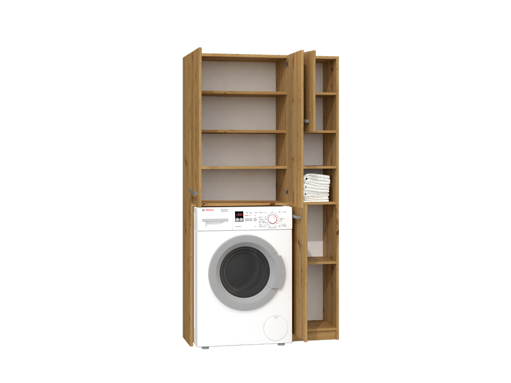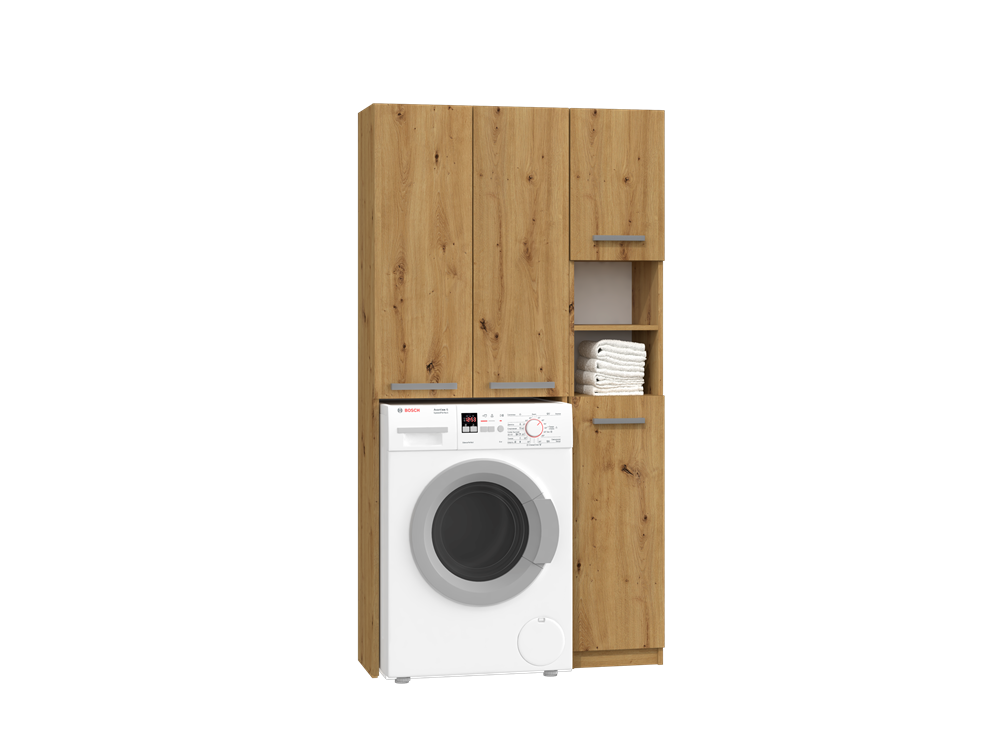 Praktiškas vonios spintelių rinkinys;Spintelių vidaus išplanavimas pavaizduotas antroje nuotraukoje;Korpusas ir fasadas pagamintas iš laminuotos medžio drožlių plokštės (MDP) su ABS kraštų apdaila;Surinkimo metu galima pasirinkti durelių atsidarymo pusę - kairę ar dešinę;Rankenėlės plastikinės, sidabro spalvos;Spintelių spalva: ruda (Artisan ąžuolas);Spintelių išmatavimai: aukštis - 183 cm, plotis – 96 cm, gylis – 30 cm.