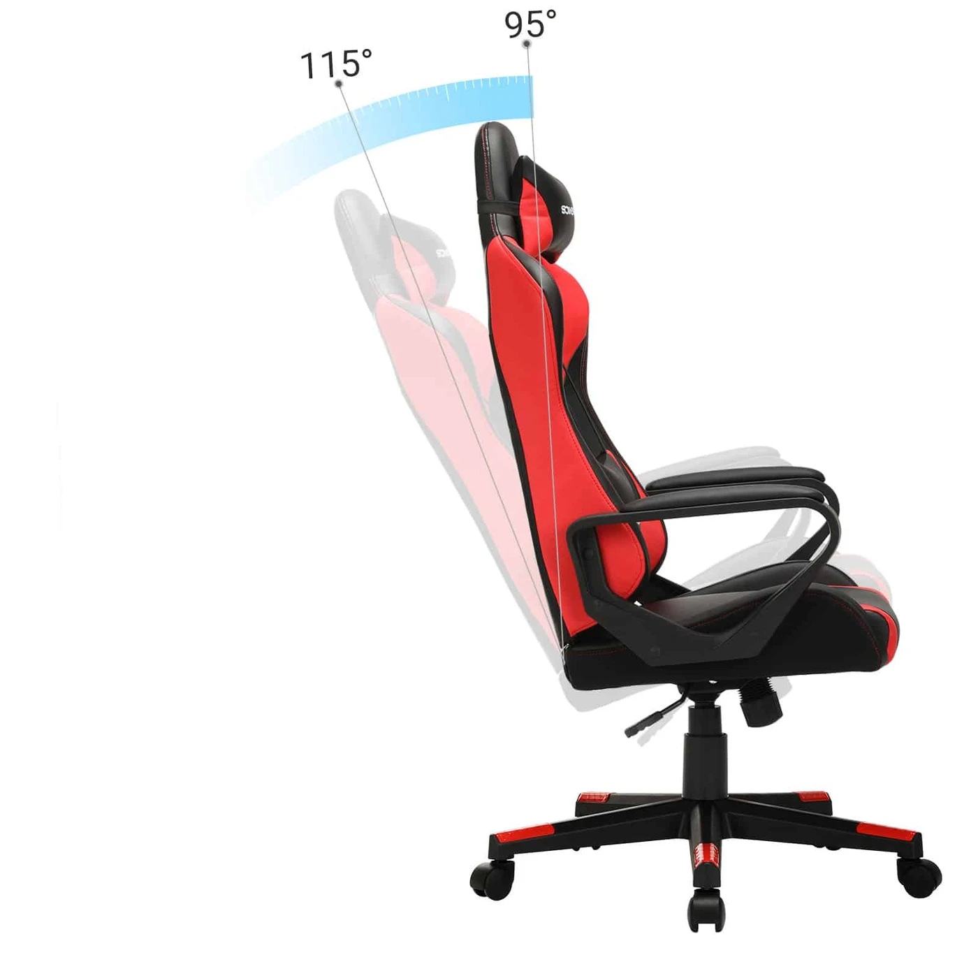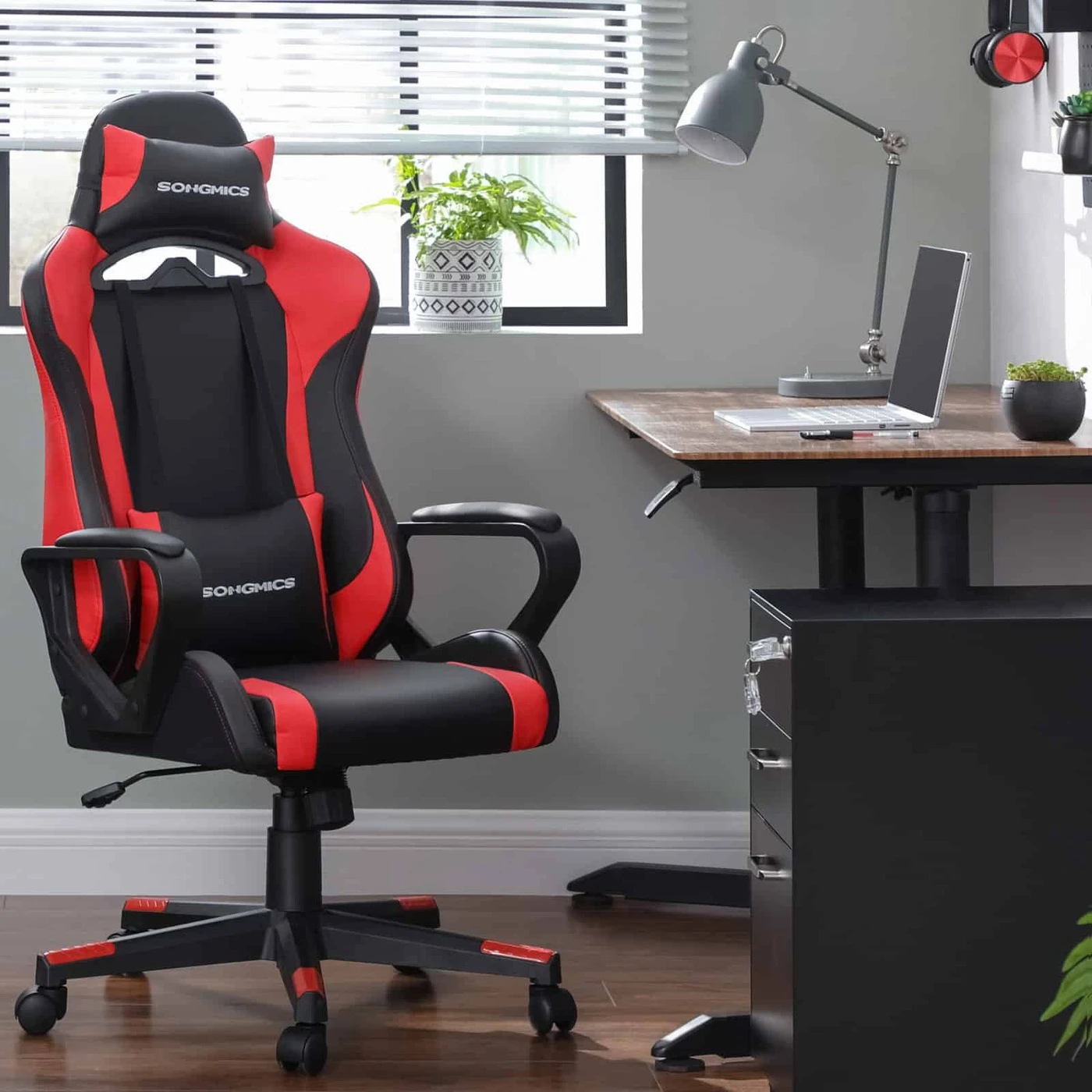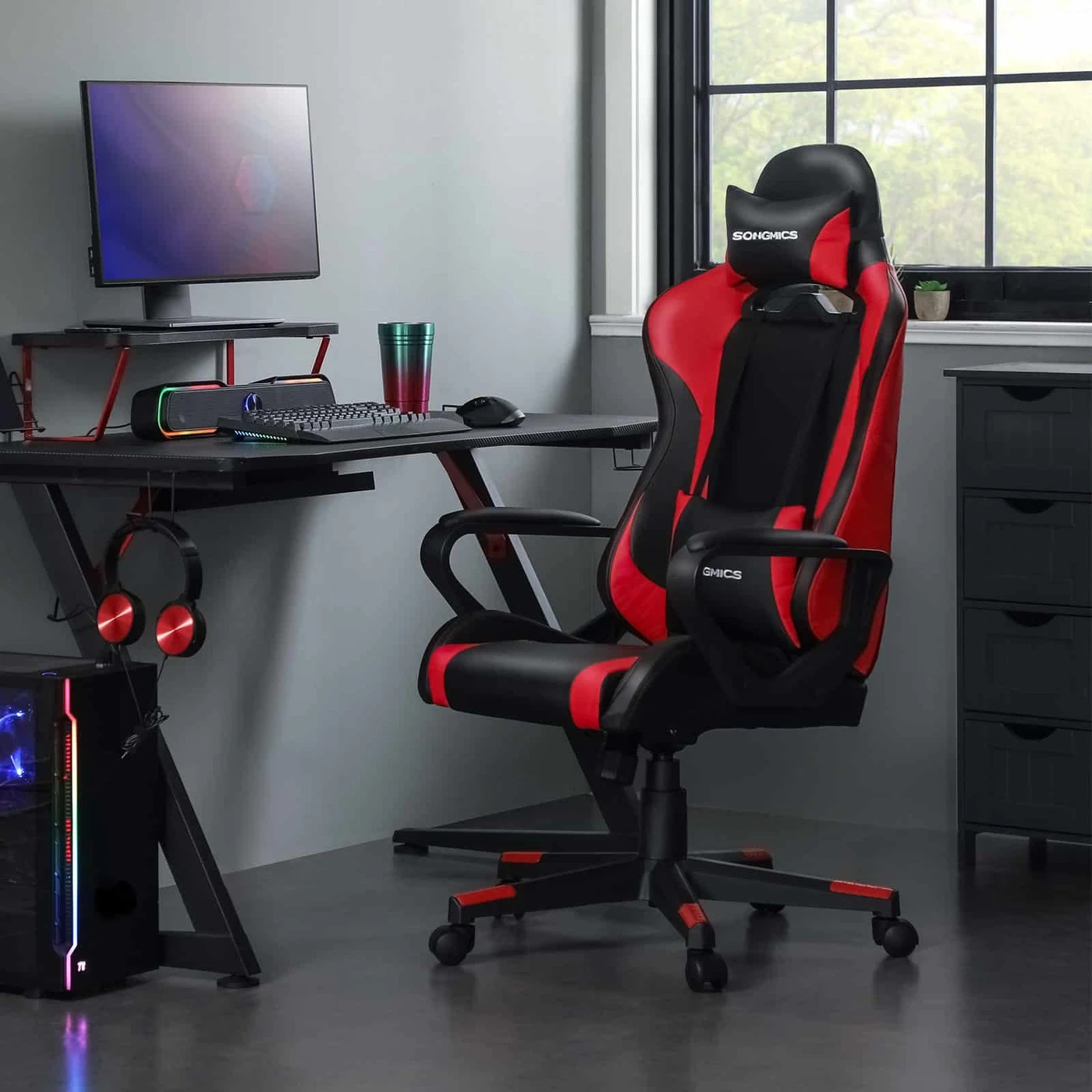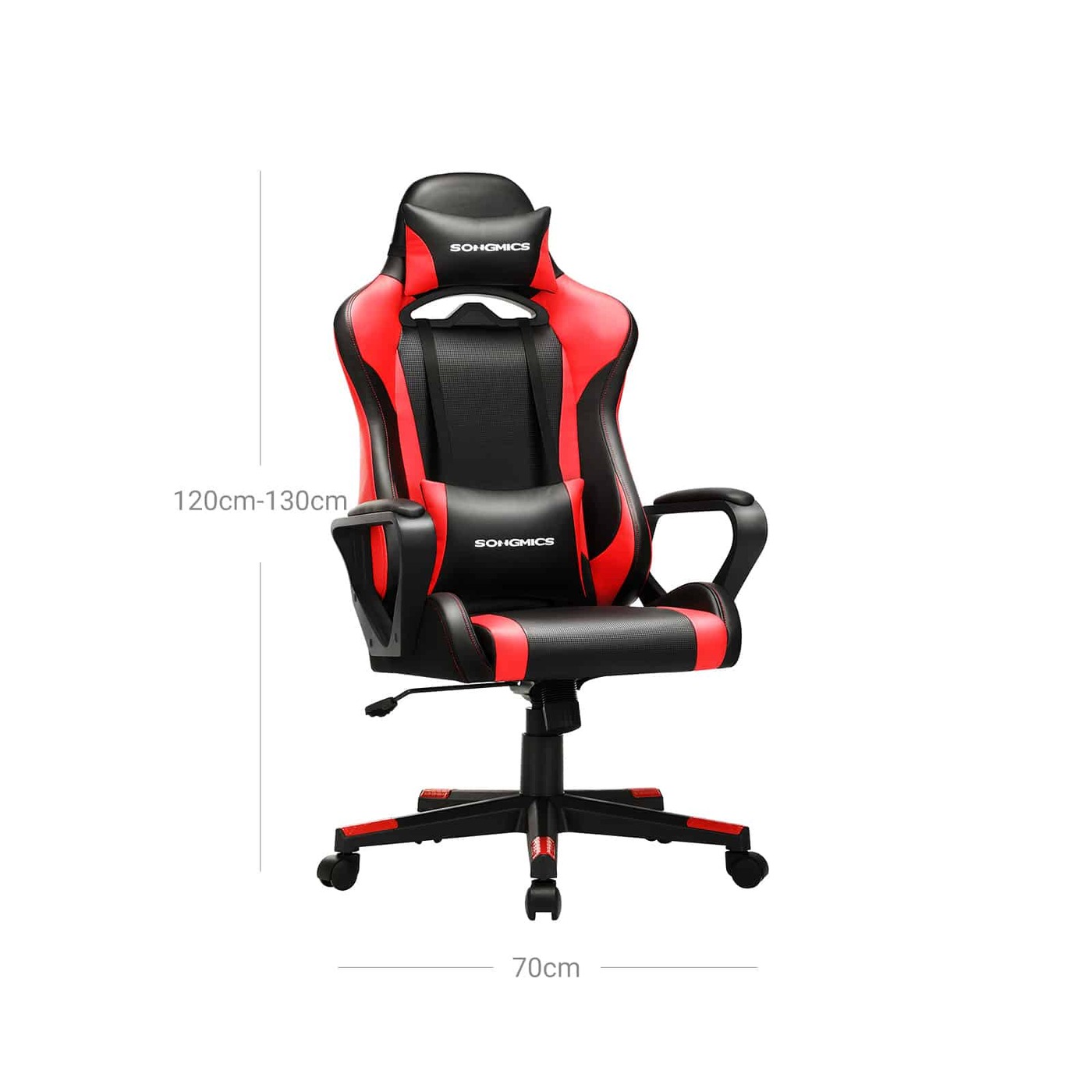 Aprašymas buvo automatiškai išverstas, gali pasitaikyti klaidų.Padidėjęs produktyvumas, pagerėjusi nuotaika: Prasta laikysena daro ir taip įtemptas darbo valandas dar labiau nepatogias. Raskite savo idealią laikyseną su šia biuro kėde: jūsų kūnas atsipalaiduos, jūsų protas bus produktyvesnis, o 8 darbo valandos praskris. Šios stalo kėdės privalumai: Reguliuokite kėdės aukštį, kad rastumėte idealią sėdėjimo padėtį, atitinkančią savo ekrano aukštį, kad rastumėte.Juosmens pagalvėlės ir ergonomiškos atlošo formos dėka visada galite dirbti atsipalaidavę ir tiesia nugara.Pasiremkite ant patogių porankių, kurie yra aptraukti PU dirbtine oda.Atpalaiduokite kaklas ir pečiai dėl aukšto atlošo su galvos atrama.Dėka siūbavimo funkcijos, kelias minutes galėsite patogiai atsipalaiduoti ir vėl pradėti žaisti!Išsami informacija apie gaminį: Spalva: juoda-raudona Medžiaga: Plieninis rėmas, putplasčio užpildas, PU sintetinės odos paviršius Bendras kėdės dydis: 71 x 63 x (120-130) cm (P x P x A) Svoris: 14,5 kg Maks. Statinė apkrova: 150 kg Pristatymo komplektas: 1 x žaidimų kėdė 1 x priedų paketas 1 x instrukcija (DE, EN, IT, FR, ES) SONGMICS Pastabos: ""Rocker funkcija"" reiškia, kad atlošas ir sėdynė vienu metu juda atgal . Šios kėdės atlošo negalima atskirai palenkti atgal.